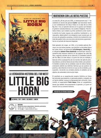 Los d%u00edas 25 y 26 de junio de 1876, un destacamento del 7. %u00ba de caballer%u00eda al mando del general Custer cay%u00f3 derrotado frente a una confederaci%u00f3n de tribus indias en el valle del r%u00edo Little Big Horn. Fue un episodio decisivo en la guerra que libraban el gobierno estadounidense y los pueblos ind%u00edgenas. Para Estados Unidos, que cumpl%u00eda su primer centenario como naci%u00f3n, la derrota de Custer supuso una aut%u00e9ntica humillaci%u00f3n y, en respuesta, desencaden%u00f3 una venganza a gran escala que, en el curso de campa%u00f1as sucesivas, culmin%u00f3 en el exterminio casi total del pueblo indio y en el encierro de los pocos supervivientes en un pu%u00f1ado de reservas dispersas. Este episodio dio origen, en 1941, a la notable pel%u00edcula Murieron con las botas puestas, que glorific%u00f3 la discutible figura de Custer. Ahora, los guionistas Luca Blengino y David Goy, y el dibujante Antoine Giner-Belmonte reconstruyen minuciosamente esta masacre hist%u00f3rica en las p%u00e1ginas de Little Big Horn, segundo volumen de la colecci%u00f3n La verdadera historia del Far West. En este %u00e1lbum, el punto de vista es m%u00faltiple y bascula entre la perspectiva de los mandos del ej%u00e9rcito estadounidense y la de los l%u00edderes de las tribus indias, pero presenta tambi%u00e9n la %u00f3ptica de los soldados rasos de ambos bandos, analizando adem%u00e1s las distintas t%u00e1cticas que se pusieron en pr%u00e1ctica, describiendo el terreno en que se dio la batalla y, por supuesto, recreando las jornadas previas al combate con el objetivo de entenderlo todo mucho mejor. El resultado es un espectacular mosaico hist%u00f3rico en forma de historieta que presenta un panorama amplio y completo de un hecho c%u00e9lebre, aunque no demasiado bien conocido. Como colof%u00f3n, el especialista Farid Ameur firma un complet%u00edsimo dosier que detalla minuciosamente el episodio y lo pone en relaci%u00f3n con su contexto hist%u00f3rico.MUERIERON CON LAS BOTAS PUESTASWESTERNVolumen de lectura independiente. Colecci%u00f3n cuatrimestralCarton%u00e9. 23,5 x 31 cm. 56 p%u00e1gs. Color PVP: 21,00 %u20ac %u2022 ISBN: 978-84-679-7363-1BLENGINO / GOY / GINER / BELMONTE / AMEURPREVIEW EN LAS P%u00c1GINAS SIGUIENTESLA VERDADERA HISTORIA DEL FAR WESTLITTLE BIGHORNNOVEDADES DICIEMBRE 2024 %u2022 C%u00d3MIC EUROPEO P%u00c1G. 15 //