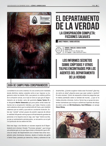 GU%u00cdA DE CAMPO PARA CONSPIRANOICOSLa realidad no es como creemos. Es una construcci%u00f3n inestable donde distintos relatos compiten entre s%u00ed por imponer su hegemon%u00eda sobre los dem%u00e1s. Esto, que parece un an%u00e1lisis pol%u00edtico de la situaci%u00f3n actual, es el eje en torno al que gira El Departamento de la Verdad, serie del guionista James Tynion IV y el dibujante Martin Simmonds que pone patas arriba todas las teor%u00edas de la conspiraci%u00f3n habidas y por haber. Gracias a esta serie sabemos ahora que la verdad est%u00e1 ah%u00ed fuera, pero tambi%u00e9n sabemos que es vol%u00e1til y que est%u00e1 en constante mutaci%u00f3n. Sobre esa %u201cverdad%u201d act%u00faan grupos de presi%u00f3n capaces de alterar la realidad influyendo sobre grupos suficientemente grandes de personas: si la mayor%u00eda cree en algo, ese %u201calgo%u201d habr%u00e1 ocurrido, ya sea un avistamiento extraterrestre, un encuentro con el yeti o el protocolo de los sabios de Si%u00f3n. Este mes llega a las librer%u00edas un volumen especial de El Departamento de la Verdad, titulado %u201cFicciones salvajes%u201d, que incluye una extensa gu%u00eda en la que figura toda la informaci%u00f3n que la Oficina de Campo del Departamento de la Verdad lleva a%u00f1os recopilando sobre fen%u00f3menos diversos, desde el hombre del garfio a Santa Claus, pasando por demonios, hadas y caimanes en las alcantarillas. %u00bfCu%u00e1ndo surgieron todas esas ficciones? %u00bfQu%u00e9 hay de cierto en ellas? %u00bfImporta acaso que sean verdad o mentira? En este volumen, Tynion da respuesta a todas las preguntas que te hab%u00edas planteado sobre la realidad del mundo%u2026 y que no te hab%u00edas atrevido a formular. Junto a Tynion hay un grupo de excelentes ilustradores que incluye a aut%u00e9nticas leyendas del dibujo de c%u00f3mic como son Bill Sienkiewicz, Kent Williams o el salvajeSimon Bisley. JAMES TYNION IV / VARIOS ARTISTASDE LA VERDADEL DEPARTAMENTOLA CONSPIRACI%u00d3N COMPLETA:FICCIONES SALVAJESLOS INFORMES SECRETOS SOBRE CR%u00cdPTIDOS Y OTROS TULPAS ENCONTRADOS POR LOS AGENTES DEL DEPARTAMENTO DE LA VERDADTERROR / THRILLER / CIENCIA FICCI%u00d3NVolumen %u00fanicoCarton%u00e9. 18 x 27,5 cm. 224 p%u00e1gs. ColorPVP: 36,00 %u20ac %u2022 ISBN: 978-84-679-7339-6NOVEDADES DICIEMBRE 2024 %u2022 C%u00d3MIC AMERICANO P%u00c1G. 21 //