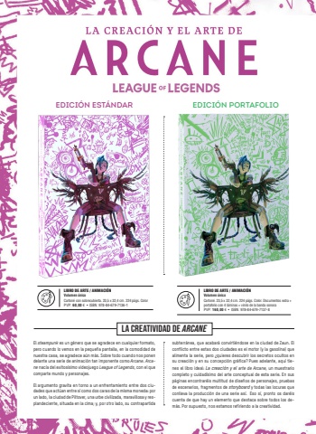 EDICI%u00d3N EST%u00c1NDAR EDICI%u00d3N PORTAFOLIOLA CREATIVIDAD DE ARCANEEl steampunk es un g%u00e9nero que se agradece en cualquier formato, pero cuando lo vemos en la peque%u00f1a pantalla, en la comodidad de nuestra casa, se agradece a%u00fan m%u00e1s. Sobre todo cuando nos ponen delante una serie de animaci%u00f3n tan imponente como Arcane. Arcane nac%u00eda del exitos%u00edsimo videojuego League of Legends, con el que comparte mundo y personajes. El argumento gravita en torno a un enfrentamiento entre dos ciudades que act%u00faan entre s%u00ed como dos caras de la misma moneda: por un lado, la ciudad de Piltover, una urbe civilizada, maravillosa y resplandeciente, situada en la cima; y, por otro lado, su contrapartida subterr%u00e1nea, que acabar%u00e1 convirti%u00e9ndose en la ciudad de Zaun. El conflicto entre estas dos ciudades es el motor (y la gasolina) que alimenta la serie, pero %u00bfquieres descubrir los secretos ocultos en su creaci%u00f3n y en su concepci%u00f3n gr%u00e1fica? Pues adelante, aqu%u00ed tienes el libro ideal: La creaci%u00f3n y el arte de Arcane, un muestrario completo y cuidad%u00edsimo del arte conceptual de esta serie. En sus p%u00e1ginas encontrar%u00e9is multitud de dise%u00f1os de personajes, pruebas de escenarios, fragmentos de storyboard y todas las locuras que conlleva la producci%u00f3n de una serie as%u00ed. Eso s%u00ed, pronto os dar%u00e9is cuenta de que hay un elemento que destaca sobre todos los dem%u00e1s. Por supuesto, nos estamos refiriendo a la creatividad.LIBRO DE ARTE / ANIMACI%u00d3N Volumen %u00fanicoCarton%u00e9 con sobrecubierta. 23,5 x 32,4 cm. 224 p%u00e1gs. ColorPVP: 60,00 %u20ac %u2022 ISBN: 978-84-679-7136-1LIBRO DE ARTE / ANIMACI%u00d3NVolumen %u00fanicoCarton%u00e9. 23,5 x 32,4 cm. 224 p%u00e1gs. Color. Documentos extra + portafolio con 4 l%u00e1minas + vinilo de la banda sonoraPVP: 160,00 %u20ac %u2022 ISBN: 978-84-679-7137-8