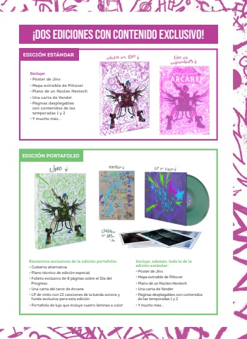 EDICI%u00d3N EST%u00c1NDAREDICI%u00d3N PORTAFOLIOIncluye:%u2022 P%u00f3ster de Jinx%u2022 Mapa extra%u00edble de Piltover%u2022 Plano de un N%u00facleo Hextech%u2022 Una carta de Vander%u2022 P%u00e1ginas desplegables con contenidos de las temporadas 1 y 2%u2022 Y mucho m%u00e1s...Elementos exclusivos de la edici%u00f3n portafolio:%u2022 Cubierta alternativa%u2022 Plano t%u00e9cnico de edici%u00f3n especial%u2022 Folleto exclusivo de 8 p%u00e1ginas sobre el D%u00eda del Progreso%u2022 Una carta del tarot de Arcane%u2022 LP de vinilo con 22 canciones de la banda sonora y funda exclusiva para esta edici%u00f3n%u2022 Portafolio de lujo que incluye cuatro l%u00e1minas a colorIncluye, adem%u00e1s, todo lo de la edici%u00f3n est%u00e1ndar:%u2022 P%u00f3ster de Jinx%u2022 Mapa extra%u00edble de Piltover%u2022 Plano de un N%u00facleo Hextech%u2022 Una carta de Vander%u2022 P%u00e1ginas desplegables con contenidosde las temporadas 1 y 2%u2022 Y mucho m%u00e1s...%u00a1DOS EDICIONES CON CONTENIDO EXCLUSIVO!