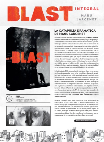 En Norma Editorial sentimos aut%u00e9ntica devoci%u00f3n por Manu Larcenet. Los dos %u00faltimos c%u00f3mics que nos ha regalado (Terapia de grupo y la adaptaci%u00f3n de La carretera) son aut%u00e9nticas obras maestras que confirman que estamos ante uno de los autores m%u00e1s en forma tanto de su generaci%u00f3n como de todo el panorama historiet%u00edstico actual. Por eso nos alegra contar en nuestro cat%u00e1logo con la mayor%u00eda de sus t%u00edtulos, incluidos La vuelta al campo, El informe de Brodeck o el ciclo Festival incluido en el %u00faltimo tomo de la edici%u00f3n integral de La Mazmorra, publicado recientemente. Hay una obra que presentamos hace casi quince a%u00f1os, pero que hoy d%u00eda resulta muy dif%u00edcil de encontrar. Nos referimos, por supuesto, a Blast, tetralog%u00eda monumental, inclasificable y genial, que reaviv%u00f3 el inter%u00e9s por Larcenet entre cr%u00edtica y p%u00fablico (que ya se hab%u00edan rendido a sus pies con Los combates cotidianos). Ahora reunimos los cuatro %u00e1lbumes de que consta Blast en un volumen integral con m%u00e1s de 800 p%u00e1ginas de extensi%u00f3n.En la d%u00e9cada de 2010, Larcenet abri%u00f3 una nueva etapa en su carrera, confirmando su estatus como autor completo y abordando un g%u00e9nero que hasta entonces hab%u00eda esquivado en su trayectoria como historietista. Era un autor sobradamente conocido por su dominio de la historieta humor%u00edstica, a la que hab%u00eda dedicado la mayor parte de su considerable talento. El lanzamiento de Blast lo catapult%u00f3 instant%u00e1neamente al Olimpo de la historieta dram%u00e1tica. Su publicaci%u00f3n cay%u00f3 como un martillazo sobre la cr%u00edtica. Con el primer volumen, Larcenet obtuvo el Premio de las Librer%u00edas especializadas en 2010, y con el segundo el gran premio RTL de historieta (que conceden de com%u00fan acuerdo librer%u00edas y cadenas de radio, y que ha distinguido entre otros autores a Gipi, Christophe Blain, %u00c9mile Bravo o nuestro Juanjo Guarnido). Larcenet consagr%u00f3 cinco a%u00f1os (de 2010 a 2014) a completar las cuatro partes de que consta Blast. El resultado es abrumador, una historia amarga que tiene parte de intriga policial, de drama psicol%u00f3gico, de viaje existencial y de descenso a los infiernos, y que cuenta con un Larcenet en plena forma, en uno de los puntos %u00e1lgidos de su carrera, tanto por la eficacia de su prosa como por la potencia expresiva de su dibujo. Una obra maestra del c%u00f3mic europeo que recuperamos al fin en una edici%u00f3n de altura. Blast es un must.LA CATAPULTA DRAM%u00c1TICA DE MANU LARCENETM A N U LARCENETINTEGRALDRAMAEdici%u00f3n integralCarton%u00e9. 20,8 x 27 cm. 816 p%u00e1gs. Color PVP: 75,00 %u20ac %u2022 ISBN: 978-84-679-7198-9PREVIEW EN LAS P%u00c1GINAS SIGUIENTES