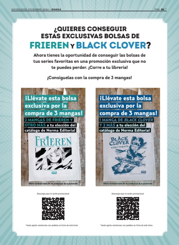 Ahora tienes la oportunidad de conseguir las bolsas de tus series favoritas en una promoci%u00f3n exclusiva que no te puedes perder. %u00a1Corre a tu librer%u00eda!%u00a1Cons%u00edguelas con la compra de 3 mangas!%u00bfQUIERES CONSEGUIRESTAS EXCLUSIVAS BOLSAS DE FRIERENYBLACK CLOVER?Descarga aqu%u00ed el cartel promocional*Hasta agotar existencias con pedidos en firme de este tomo. *Hasta agotar existencias con pedidos en firme de este tomo.Descarga aqu%u00ed el cartel promocionalNOVEDADES DICIEMBRE 2024 %u2022 MANGA P%u00c1G. 30 //
