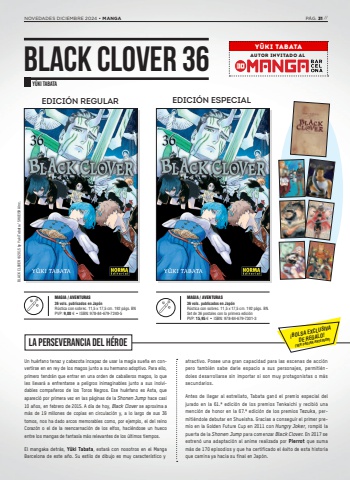 Un hu%u00e9rfano tenaz y cabezota incapaz de usar la magia sue%u00f1a en convertirse en en rey de los magos junto a su hermano adoptivo. Para ello, primero tendr%u00e1n que entrar en una orden de caballeros magos, lo que les llevar%u00e1 a enfrentarse a peligros inimaginables junto a sus inolvidables compa%u00f1eros de los Toros Negros. Ese hu%u00e9rfano es Asta, que apareci%u00f3 por primera vez en las p%u00e1ginas de la Shonen Jump hace casi 10 a%u00f1os, en febrero de 2015. A d%u00eda de hoy, Black Clover se aproxima am%u00e1s de 19 millones de copias en circulaci%u00f3n y, a lo largo de sus 36 tomos, nos ha dado arcos memorables como, por ejemplo, el del reino Coraz%u00f3n o el de la reencarnaci%u00f3n de los elfos, haci%u00e9ndose un hueco entre los mangas de fantas%u00eda m%u00e1s relevantes de los %u00faltimos tiempos. El mangaka detr%u00e1s, Y%u00fbki Tabata, estar%u00e1 con nosotros en el Manga Barcelona de este a%u00f1o. Su estilo de dibujo es muy caracter%u00edstico y atractivo. Posee una gran capacidad para las escenas de acci%u00f3n pero tambi%u00e9n sabe darle espacio a sus personajes, permiti%u00e9ndoles desarrollarse sin importar si son muy protagonistas o m%u00e1s secundarios.Antes de llegar al estrellato, Tabata gan%u00f3 el premio especial del jurado en la 61.%u00aa edici%u00f3n de los premios Tenkaichi y recibi%u00f3 una menci%u00f3n de honor en la 67.%u00aa edici%u00f3n de los premios Tezuka, permiti%u00e9ndole debutar en Shueisha. Gracias a conseguir el primer premio en la Golden Future Cup en 2011 con Hungry Joker, rompi%u00f3 la puerta de la Shonen Jump para comenzar Black Clover. En 2017 se estren%u00f3 una adaptaci%u00f3n al anime realizada por Pierrot que suma m%u00e1s de 170 episodios y que ha certificado el %u00e9xito de esta historia que camina ya hacia su final en Jap%u00f3n.Y%u00dbKI TABATABLACK CLOVER 36MAGIA / AVENTURAS36 vols. publicados en Jap%u00f3nR%u00fastica con sobrec. 11,5 x 17,5 cm. 192 p%u00e1gs. BN PVP: 9,00 %u20ac %u2022 ISBN: 978-84-679-7240-5MAGIA / AVENTURAS36 vols. publicados en Jap%u00f3nR%u00fastica con sobrec. 11,5 x 17,5 cm. 192 p%u00e1gs. BN.Set de 36 postales con la primera edici%u00f3n PVP: 15,95 %u20ac %u2022 ISBN: 978-84-679-7301-3LA PERSEVERANCIA DEL H%u00c9ROEEDICI%u00d3N REGULAR EDICI%u00d3N ESPECIALY%u00dbKI TABATAAUTOR INVITADO AL%u00a1BOLSA EXCLUSIVA DE REGALO!(VER P%u00c1GINA ANTERIOR)BLACK CLOVER %u00a92015 by Yuki Tabata / SHUEISHA Inc.NOVEDADES DICIEMBRE 2024 %u2022 MANGA P%u00c1G. 31 //