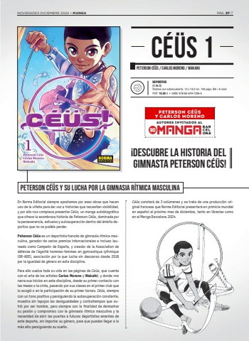 En Norma Editorial siempre apostamos por esas obras que hacen uso de la vi%u00f1eta para dar voz a historias que necesitan visibilidad, y por ello nos complace presentar C%u00e9%u00fcs, un manga autobiogr%u00e1fico que ofrece la asombrosa historia de Peterson C%u00e9%u00fcs, dominada por la perseverancia, esfuerzo y autosuperaci%u00f3n dentro del %u00e1mbito deportivo que no os pod%u00e9is perder.Peterson C%u00e9%u00fcs es un deportista franc%u00e9s de gimnasia r%u00edtmica masculina, ganador de varios premios internacionales e incluso laureado como Campe%u00f3n de Espa%u00f1a, y creador de la Association de d%u00e9fense de l%u2019%u00e9galit%u00e9 hommes-femmes en gymnastique rythmique (GR-ADE), asociaci%u00f3n por la que lucha sin descanso desde 2018 por la igualdad de g%u00e9nero en esta disciplina.Para ello vuelca toda su vida en las p%u00e1ginas de C%u00e9%u00fcs, que cuenta con el arte de los artistas Carlos Moreno y Wakaiki, y donde nos narra sus inicios en esta disciplina, desde su primer contacto con las mazas o la cinta, pasando por sus clases en el primer club que lo acogi%u00f3 o en la participaci%u00f3n de su primer torneo. C%u00e9%u00fcs, siempre con un tono positivo y persiguiendo la autosuperaci%u00f3n constante, muestra sin tapujos las desigualdades y contratiempos que sufri%u00f3 por ser hombre, pero siempre con la finalidad de demostrar su pasi%u00f3n y compromiso con la gimnasia r%u00edtmica masculina y la necesidad de abrir las puertas a futuros deportistas amantes de este deporte, sin importar su g%u00e9nero, para que puedan llegar a lo m%u00e1s alto persiguiendo su sue%u00f1o. C%u00e9%u00fcs constar%u00e1 de 3 vol%u00famenes y se trata de una producci%u00f3n original francesa que Norma Editorial presentar%u00e1 en primicia mundial en espa%u00f1ol el pr%u00f3ximo mes de diciembre, tanto en librer%u00edas como en el Manga Barcelona 2024.PETERSON C%u00c9%u00dcS / CARLOS MORENO / WAKAIKIC%u00c9%u00dcS 1DEPORTIVO(1 de 3)R%u00fastica con sobrecubierta. 13 x 18,2 cm. 194 p%u00e1gs. BN + 8 color PVP: 10,00 %u20ac %u2022 ISBN: 978-84-679-7295-5PETERSON C%u00c9%u00dcS Y SU LUCHA POR LA GIMNASIA R%u00cdTMICA MASCULINA PETERSON C%u00c9%u00dcS Y CARLOS MORENOAUTORES INVITADOS AL%u00a1DESCUBRE LA HISTORIA DEL GIMNASTA PETERSON C%u00c9%u00dcS!NOVEDADES DICIEMBRE 2024 %u2022 MANGA P%u00c1G. 37 //