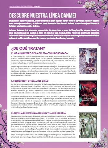 NOVEDADES DICIEMBRE 2024 %u2022 DANMEI%u00bfDE QU%u00c9 TRATAN?EL GRAN MAESTRO DE LA CULTIVACI%u00d3N DEMON%u00cdACAEl cruento asedio a la colina de las fosas ha puesto fin al reinado del terror del patriarca de Yiling, y el mundo cultivacional ha recuperado la paz%u2026 Una paz que dura exactamente trece a%u00f1os, hasta que Wei Wuxian, el patriarca de Yiling, despierta nuevamente a la vida, esta vez dentro del cuerpo de un mediocre cultivador que ha sacrificado su alma en busca de venganza. En esta segunda vida Wei Wuxian tampoco tendr%u00e1 descanso. Perseguido por su pasado y por un misterio que amenaza con volver a desencadenar el caos en el mundo, tendr%u00e1 que buscar aliados entre aquellos que lo odiaban y lo mataron. Sorprendentemente, encontrar%u00e1 su mayor apoyo en Lan Wangji, un virtuoso cultivador al que conoci%u00f3 en su adolescencia y de car%u00e1cter tan recto y formal como Wei Wuxian es travieso y malicioso.LA BENDICI%u00d3N OFICIAL DEL CIELOXie Lian, el pr%u00edncipe heredero del pr%u00f3spero reino de Xianle, es un joven lleno de virtudes: excelso en el estudio de las artes de la cultivaci%u00f3n, hermoso, fuerte y de convicciones puras. Son tantos sus dones que no tarda en ascender como inmortal a la corte celestial. Sin embargo, Xie Lian tiene un defecto: su tremenda mala suerte, que lo lleva a cometer tales errores que acaba siendo desterrado de los cielos, regresando al mundo terrenal. Y esta haza%u00f1a se repite no una, %u00a1sino tres veces! Ochocientos a%u00f1os despu%u00e9s de su primer ascenso, Xie Lian se encuentra de nuevo en el reino mortal, dispuesto a obtener los m%u00e9ritos necesarios para ser perdonado por el resto de inmortales. Para ello, deber%u00e1 llevar a cabo todo tipo de trabajos para la corte celestial, desde resolver misterios hasta en,frentarse a demonios y fantasmas. En uno de sus viajes conoce a un alegre joven, San Lang, con el que siente una inmediata conexi%u00f3n. Sin embargo, detr%u00e1s de su sonrisa, San Lang parece esconder algo mucho m%u00e1s enigm%u00e1tico%u2026 hasta siniestro%u2026EL SISTEMA DE AUTOSALVACI%u00d3N DEL VILLANO ESCORIADespu%u00e9s de una infancia humilde, y tras superar un pasado tortuoso, el mediodemonio Luo Binghe se ha convertido en el parang%u00f3n de la fuerza y la belleza. Con su dominio sobre los dos reinos, el humano y el demon%u00edaco, y con un har%u00e9n de cientos de mujeres a sus pies, es el protagonista m%u00e1s poderoso%u2026 %u00a1de una serie de novelas baratas! Al menos, eso es lo que opina Shen Yuan nada m%u00e1s acabar el %u00faltimo cap%u00edtulo de La senda del orgulloso demonio inmortal. Pero cuando muere en pleno ataque de rabia, Shen Yuan renace en el mundo de la novela, en el cuerpo de Shen Qingqiu, el hermoso pero cruel profesor de un, por entonces, joven Luo Binghe. Aunque Shen Qingqiu tiene un poder incre%u00edble como cultivador, su destino es ser castigado de la forma m%u00e1s terrible por cr%u00edmenes cometidos contra el protagonista.Ahora, la %u00fanica posibilidad que tiene el nuevo Shen Qingqiu es intentar ganarse el aprecio de Luo Bin,ghe antes de que el joven llegue al poder o sufrir%u00e1 el fatal destino de la mayor escoria entre los villanos..En 2023 dimos a conocer el danmei, t%u00e9rmino chino que se refiere al g%u00e9nero literario donde se representan relaciones afectivas entre personajes masculinos, y lo hicimos a trav%u00e9s de nuestra L%u00ednea Danmei, dedicada a narrar las mejores historias de fantas%u00eda y romance procedentes de China. Ya hemos disfrutado de la autora m%u00e1s representativa del g%u00e9nero hasta la fecha, Mo Xiang Tong Xiu, as%u00ed como de sus tres obras superventas que han desatado la fiebre del danmei en todo el mundo: El Gran Maestro de la Cultivaci%u00f3n Demon%u00edaca,La bendici%u00f3n del Oficial del Cielo y El sistema de autosalvaci%u00f3n del Villano Escoria, tres series que plantean mundos fant%u00e1sticos repletos de acci%u00f3n, maldiciones, esp%u00edritus y amores que trascienden a la vida y la muerte.DESCUBRE NUESTRA L%u00cdNEA DANMEI