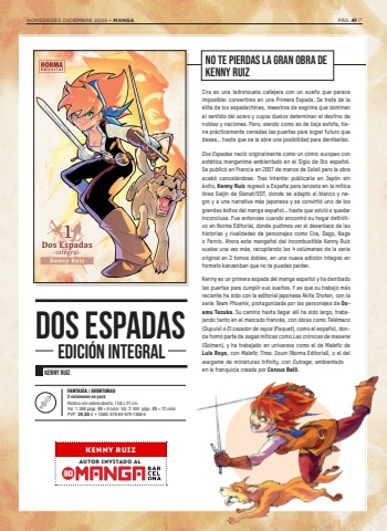 FANTAS%u00cdA / AVENTURAS2 vol%u00famenes en packR%u00fastica con sobrecubierta. 14,8 x 21 cm. Vol. 1: 368 p%u00e1gs. BN + 8 color. Vol. 2: 404 p%u00e1gs. BN + 12 colorPVP: 29,00 %u20ac %u2022 ISBN: 978-84-679-7368-6NO TE PIERDAS LA GRAN OBRA DE KENNY RUIZCira es una ladronzuela callejera con un sue%u00f1o que parece imposible: convertirse en una Primera Espada. Se trata de la %u00e9lite de los espadachines, maestros de esgrima que dominan el sentido del acero y cuyos duelos determinan el destino de nobles y naciones. Pero, siendo como es de baja estofa, tiene pr%u00e1cticamente cerradas las puertas para lograr futuro que desea... hasta que se le abre una posibilidad para derribarlas.Dos Espadas naci%u00f3 originalmente como un c%u00f3mic europeo con est%u00e9tica manganime ambientado en el Siglo de Oro espa%u00f1ol. Se public%u00f3 en Francia en 2007 de manos de Soleil pero la obra acab%u00f3 cancel%u00e1ndose. Tras intentar publicarla en Jap%u00f3n sin %u00e9xito, Kenny Ru%u00edz regres%u00f3 a Espa%u00f1a para lanzarla en la m%u00edtica l%u00ednea Gaijin de Glenat/EDT, donde se adapt%u00f3 al blanco y negro y a una narrativa m%u00e1s japonesa y se convirti%u00f3 uno de los grandes %u00e9xitos del manga espa%u00f1ol... hasta que volvi%u00f3 a quedar inconclusa. Fue entonces cuando encontr%u00f3 su hogar definitivo en Norma Editorial, donde pudimos ver el desenlace de las historias y rivalidades de personajes como Cira, Dago, Naga o Fenris. Ahora este manga%u00f1ol del incombustible Kenny Ru%u00edz vuelve una vez m%u00e1s, recopilando los 4 vol%u00famenes de la serie original en 2 tomos dobles, en una nueva edici%u00f3n integral en formato kanzenban que no te puedes perder.Kenny es un primera espada del manga espa%u00f1ol y ha derribado las puertas para cumplir sus sue%u00f1os. Y es que su trabajo m%u00e1s reciente ha sido con la editorial japonesa Akita Shoten, con la serie Team Phoenix, protagonizada por los personajes de Osamu Tezuka. Su camino hasta llegar all%u00ed ha sido largo, trabajando tanto en el mercado franc%u00e9s, con obras como Tel%u00e9maco (Dupuis) o El cazador de rayos (Paquet), como el espa%u00f1ol, donde form%u00f3 parte de sagas m%u00edticas como Las cr%u00f3nicas de mesene (Dolmen), y ha trabajado en universos como el de Malefic de Luis Royo, con Malefic Time: Soum (Norma Editorial), o el del wargame de miniaturas Infinity, con Outrage, ambientado en la franquicia creada por Corvus Belli.P%u00c1G. 41 // KENNY RUIZDOS ESPADASEDICI%u00d3N INTEGRALKENNY RUIZAUTOR INVITADO ALNOVEDADES DICIEMBRE 2024 %u2022 MANGA P%u00c1G. 41 //