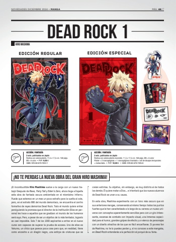 %u00a1El incombustible Hiro Mashima vuelve a la carga con un nuevo trabajo! Despu%u00e9s de Rave, Fairy Tail y Eden%u2019s Zero, ahora llega a Espa%u00f1a esta obra de fantas%u00eda oscura ambientada en el mism%u00edsimo infierno. Puede que estemos en un mes un poco extra%u00f1o para la vuelta al cole, pero, en el estrato 666 del mundo demon%u00edaco, se encuentra el centro formativo de reyes demonios Dead Rock. Todo el mundo quiere entrar persiguiendo la promesa que el director de la instituci%u00f3n (Dios en persona) les hace a aquellos que se grad%u00faan: el mundo de los humanos ser%u00e1 suyo. Pero, a pesar de ser un objetivo de lo m%u00e1s tentador, lograrlo es casi imposible. Solo 7 de los 1000 aspirantes a entrar en el nuevo curso son capaces de superar la prueba de acceso. Uno de ellos es Yakumo, un chico que parece poca cosa pero que, en realidad, tiene como ancestro a un drag%u00f3n negro, una estirpe de criaturas que se cre%u00edan extintas. Su objetivo, sin embargo, es muy distinto al de todos los dem%u00e1s. %u00c9l quiere matar a Dios... e intentar%u00e1 que los nuevos alumnos de Dead Rock se unan a su causa.En esta obra, Mashima experimenta con un tono m%u00e1s oscuro que en sus anteriores mangas, conservando al mismo tiempo todos los puntos fuertes que le han caracterizado a lo largo de su carrera: un nuevo universo con conceptos aparentemente sencillos pero con un giro interesante, escenas de combate con impacto visual, una inmensa capacidad para el humor, grandes golpes de efecto y un elenco de personajes con un dise%u00f1o atractivo de los que es f%u00e1cil encari%u00f1arse. Si ya eres fan de Mashima, no te lo puedes perder y, si no conoces a este mangaka, en Dead Rock entender%u00e1s a la perfecci%u00f3n el porqu%u00e9 de su fama.HIRO MASHIMADEAD ROCK 1ACCI%u00d3N / FANTAS%u00cdA3 vols. publicados en Jap%u00f3nR%u00fastica con sobrecubierta. 11,5 x 17,5 cm. 168 p%u00e1gs. BN + 6 color %u2022 PVP: 9,00 %u20acISBN: 978-84-679-7024-1ACCI%u00d3N / FANTAS%u00cdA3 vols. publicados en Jap%u00f3nR%u00fastica con sobrecubierta reversible. 11,5 x 17,5 cm. 168 p%u00e1gs. BN + 6 color P%u00f3ster + 2 marcap%u00e1ginas + 1 marcap%u00e1ginas imantado + set de tatuajes temporales+ metacrilato. %u2022 PVP: 18,00 %u20ac %u2022 ISBN: 978-84-679-7025-8%u00a1NO TE PIERDAS LA NUEVA OBRA DEL GRAN HIRO MASHIMA!EDICI%u00d3N REGULAR EDICI%u00d3N ESPECIAL%u00a9Hiro Mashima/ KODANSHA LTD. NOT FOR SALE%u00a9Hiro Mashima/ KODANSHA LTD. NOT FOR SALENOVEDADES DICIEMBRE 2024 %u2022 MANGA P%u00c1G. 44 //