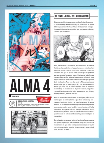 CIENCIA FICCI%u00d3N / AVENTURA(4 de 4)R%u00fastica con sobrecubierta. 13 x 18,2 cm. 190 p%u00e1gs. BN + 10 colorPVP: 10,00 %u20ac %u2022 ISBN: 978-84-679-6837-8EL FINAL -O NO- DE LA HUMANIDAD Este mes de diciembre ponemos punto y final a Alma, primera obra de Shinji Mito en Espa%u00f1a y en el cat%u00e1logo de Norma Editorial, que nos retrata un futuro dist%u00f3pico nada halag%u00fce%u00f1o para el futuro de la humanidad que podr%u00eda estar m%u00e1s cerca de lo que pensamos. Alma, de tan solo 4 vol%u00famenes, es una historia de ciencia ficci%u00f3n postapocal%u00edptica en la que humanos y m%u00e1quinas han llevado al mundo como lo conocemos a su final. En ese futuro est%u00e1 Rei, que no puede evitar pensar que es probable que sea uno de los pocos supervivientes de toda la raza humana. Pese a ello, alberga la esperanza suficiente para seguir buscando otros como %u00e9l entre las ruinas que quedan de la civilizaci%u00f3n. Pasa sus d%u00edas junto a Trice, una chica de armas tomar que se preocupa por %u00e9l y con la que ha estado desde que tiene uso de raz%u00f3n. Mientras trata de entender su soledad, en su cabeza no deja de hacerse preguntas: %u00bfpor qu%u00e9 han desaparecido todas las personas que vivieron antes que ellos? %u00bfAd%u00f3nde han ido? Alma ha demostrado ser un relato incisivo pero po%u00e9tico, con tiempo para lo contemplativo y que toca temas muy centrales en la ciencia ficci%u00f3n y el transhumanismo. Se apoya adem%u00e1s en un arte extraordinario que muestra trepidantes escenas de acci%u00f3n, pero tambi%u00e9n momentos de quietud y detallando a la perfecci%u00f3n los paisajes desolados de un mundo hecho pedazos, lleno de huellas del mundo que fue, y vaticinando un futuro donde solo haya oscuridad para la humanidad.Con esta obra cerramos el tel%u00f3n de la miseria humana y solo nos queda esperar por m%u00e1s obras de Shinji Mito, autor que ha demostrado que sabe hormiguearnos debajo de la piel con relatos y vi%u00f1etas repletas de esperanza y pesar. %u00bfSer%u00e1 2025 la vuelta de Mito%u2026? SHINJI MITOALMA 4%u00a1%u00daLTIMO VOLUMEN!ALMA %u00a9 2019 by Shinji Mito / SHUEISHA Inc.NOVEDADES DICIEMBRE 2024 %u2022 MANGA P%u00c1G. 46 //