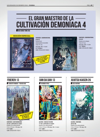 FANTAS%u00cdA / COSTUMBRISMO13 vols. publicados en Jap%u00f3nR%u00fastica con sobrecubierta 11,5 x 17,5 cm. 192 p%u00e1gs. BNPVP: 9,00 %u20ac ISBN: 978-84-679-7133-0ACCI%u00d3N / CIENCIA FICCI%u00d3N17 vols. publicados en Jap%u00f3nR%u00fastica con sobrecubierta 11,5 x 17,5 cm. 208 p%u00e1gs. BN + 2 colorPVP: 9,00 %u20ac ISBN: 978-84-679-7128-6ACCI%u00d3N / FANTAS%u00cdA(26 de 30)R%u00fastica con sobrecubierta 11,5 x 17,5 cm. 192 p%u00e1gs. BNPVP: 9,00 %u20ac ISBN: 978-84-679-7175-0FRIEREN 13 DAN DA DAN 13 JUJUTSU KAISEN 26KANEHITO YAMADA / TSUKASA ABE YUKINOBU TATSU GEGE AKUTAMIFANTAS%u00cdA / SOBRENATURAL(4 de 5)Carton%u00e9 con sobrecubierta reversible 14,8 x 21 cm. 440 p%u00e1gs. BN + 4 color PVP: 25,95 %u20ac ISBN: 978-84-679-7309-9FANTAS%u00cdA / SOBRENATURAL(4 de 5)R%u00fastica con solapas14,8 x 21 cm. 440 p%u00e1gs. BN + 4 color PVP: 18,95 %u20ac ISBN: 978-84-679-7308-2EL GRAN MAESTRO DE LACULTIVACI%u00d3N DEMON%u00cdACA 4MO XIANG TONG XIU%u00a1CON EXCLUSIVASPOSTALES DE REGALO EN LA PRIMERA EDICI%u00d3N!%u00a1BOLSA EXCLUSIVA DE REGALO!(VER P%u00c1GINA 30)EDICI%u00d3N ESPECIALNOVEDADES DICIEMBRE 2024 %u2022 MANGA P%u00c1G. 47 //