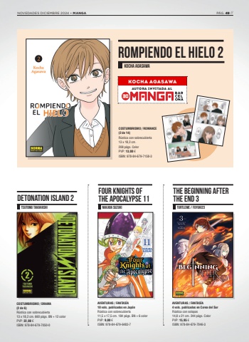 COSTUMBRISMO / DRAMA(2 de 6)R%u00fastica con sobrecubierta 13 x 18,2 cm. 660 p%u00e1gs. BN + 12 color PVP: 22,00 %u20ac ISBN: 978-84-679-7050-0AVENTURAS / FANTAS%u00cdA4 vols. publicados en Corea del SurR%u00fastica con solapas14,8 x 21 cm. 244 p%u00e1gs. ColorPVP: 15,95 %u20ac ISBN: 978-84-679-7046-3THE BEGINNING AFTER DETONATION ISLAND 2 THE END 3TSUTOMU TAKAHASHI TURTLEME / FUYUKI23AVENTURAS / FANTAS%u00cdA18 vols. publicados en Jap%u00f3nR%u00fastica con sobrecubierta 11,5 x 17,5 cm. 184 p%u00e1gs. BN + 6 color PVP: 9,00 %u20ac ISBN: 978-84-679-6483-7FOUR KNIGHTS OF THE APOCALYPSE 11NAKABA SUZUKICOSTUMBRISMO / ROMANCE(2 de 14)R%u00fastica con sobrecubierta 13 x 18,2 cm. 208 p%u00e1gs. Color PVP: 13,00 %u20ac ISBN: 978-84-679-7158-3Kocha AgasawaROMPIENDO EL HIELO 2KOCHA AGASAWAAUTORA INVITADA ALNOVEDADES DICIEMBRE 2024 %u2022 MANGA P%u00c1G. 49 //