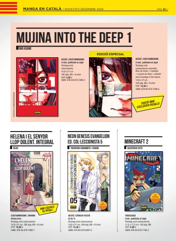 MANGA EN CATAL%u00c0 %u2022 NOVETATS DESEMBRE 2024 P%u00c1G. 51 // COSTUMBRISME / DRAMAVolum %u00fanicR%u00fastega amb sobrecoberta 14,8 x 21 cm. 392 p%u00e0g. BN + 8 colorPVP: 18,00 %u20ac ISBN: 978-84-679-7288-7ACCI%u00d3 / CI%u00c8NCIA-FICCI%u00d3(5 de 7)R%u00fastega amb sobrecoberta 14,8 x 21 cm. 340 p%u00e0g. BN + 8 colorPVP: 14,95 %u20ac ISBN: 978-84-679-5997-0VIDEOJOCS9 vol. publicats al Jap%u00f3R%u00fastega amb sobrecoberta 11,5 x 17,5 cm. 192 p%u00e0g. BNPVP: 9,00 %u20ac ISBN: 978-84-679-7106-4HELENA I EL SENYORLLOP DOLENT. INTEGRALNEON GENESIS EVANGELIONED. COL%u00b7LECCIONISTA 5 MINECRAFT 2BLISS YOSHIYUKI SADAMOTO / KHARA KAZUYOSHI SETOACCI%u00d3 / COSTUMBRISME3 vols. publicats al Jap%u00f3R%u00fastega amb sobrecoberta14,8 x 21 cm. 192 p%u00e0g. BN + 8 colorPVP: 9,00 %u20ac ISBN: 978-84-679-7289-4ACCI%u00d3 / COSTUMBRISME3 vols. publicats al Jap%u00f3R%u00fastega amb sobrecoberta reversible.Bloc de notes + 4 postals + 4 punts de llibre + shikishi amb missatge d%u2019Inio Asano.14,8 x 21 cm. 192 p%u00e0g. BN + 8 colorPVP: 15,95 %u20ac ISBN: 978-84-679-7298-6MUJINA INTO THE DEEP 1INIO ASANOEDICI%u00d3 ESPECIALEDICI%u00d3 AMB EXCLUSIUS REGALS! AMB POSTALSDE REGAL! %u00a9%ufe0f2023 Inio ASANO/SHOGAKUKAN