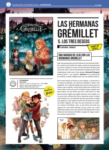 Este mes presentamos el quinto %u00e1lbum de Las hermanas Gr%u00e9millet, nuestra serie familiar de magia y aventuras protagonizada por Sarah, Casiopea y Lucille, las tres hermanas m%u00e1s guays del mundo del c%u00f3mic, que en este episodio se preparan para recibir la Navidad por todo lo alto. Como siempre, Giovanni Di Gregorio borda el guion. Y, por supuesto, Barbucci no se queda atr%u00e1s en el dibujo, creando im%u00e1genes que son una aut%u00e9ntica delicia. Esta nueva historia se titula Los tres deseos, y transcurre en la v%u00edspera de Navidad. Las hermanas Gr%u00e9millet lo tienen todo preparado, han comprado regalos para todo el mundo, para sus padres, para su abuela, %u00a1incluso para el gato! Pero a %u00faltima hora se han dado cuenta de que han olvidado comprar regalos para ellas mismas, as%u00ed que tienen que salir a toda prisa a la calle para encontrar regalos que valgan la pena (y, como sab%u00e9is, eso no es tan f%u00e1cil el %u00faltimo d%u00eda). Pero la suerte les sonr%u00ede. En plena calle tropiezan con un Pap%u00e1 Noel que tiene para ellas un regalo muy especial. %u00bfY qu%u00e9 regalo es ese? Pues se trata de tres cajas de cerillas m%u00e1gicas: por cada una que enciendan se cumplir%u00e1 un deseo. El problema, claro, es que tienen que estar muy seguras de lo que est%u00e1n pidiendo. As%u00ed que %u00bfc%u00f3mo van a estar totalmente seguras de lo que quieren? As%u00ed empieza esta nueva historia de las hermanas Gr%u00e9millet, cargada de magia, sorpresas y buenos sentimientos.UNA NAVIDAD DE LUJO CON LAS HERMANAS GREMILLETLAS HERMANASDI GREGORIO / BARBUCCICOSTUMBRISMOSerie abiertaCarton%u00e9. 21,2 x 28,2 cm. 48 p%u00e1gs. Color %u2022 PVP: 16,95 %u20acISBN ED. CASTELLANO: 978-84-679-7151-4ISBN ED. CATAL%u00c0: 978-84-679-7152-15. LOS TRES DESEOSGR%u00c9MILLETA PARTIR DE9 A%u00d1OS TAMB%u00c9 ENCATAL%u00c0NOVEDADES DICIEMBRE 2024 %u2022 ASTRONAVE P%u00c1G. 63 //
