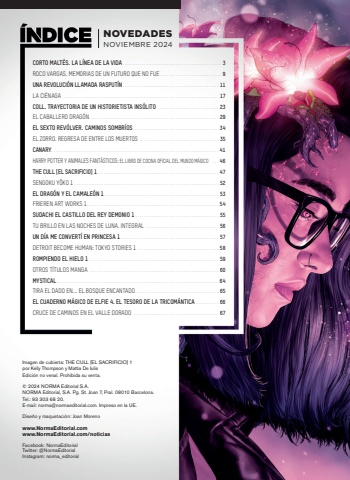 CORTO MALT%u00c9S. LA L%u00cdNEA DE LA VIDA............................................... 3ROCO VARGAS. MEMORIAS DE UN FUTURO QUE NO FUE ............................. 9UNA REVOLUCI%u00d3N LLAMADA RASPUT%u00cdN.............................................. 11LA CI%u00c9NAGA .......................................................................... 17COLL. TRAYECTORIA DE UN HISTORIETISTA INS%u00d3LITO ............................. 23EL CABALLERO DRAG%u00d3N.............................................................. 29EL SEXTO REV%u00d3LVER. CAMINOS SOMBR%u00cdOS......................................... 34EL ZORRO. REGRESA DE ENTRE LOS MUERTOS ...................................... 35CANARY................................................................................ 41HARRY POTTER Y ANIMALES FANT%u00c1STICOS: EL LIBRO DE COCINA OFICIAL DEL MUNDO M%u00c1GICO ... 46THE CULL [EL SACRIFICIO] 1.......................................................... 47 SENGOKU Y%u00d4KO 1 ..................................................................... 52EL DRAG%u00d3N Y EL CAMALE%u00d3N 1....................................................... 53FRIEREN ART WORKS 1............................................................... 54SUDACHI EL CASTILLO DEL REY DEMONIO 1 ........................................ 55 TU BRILLO EN LAS NOCHES DE LUNA. INTEGRAL ................................... 56UN D%u00cdA ME CONVERT%u00cd EN PRINCESA 1............................................... 57DETROIT BECOME HUMAN: TOKYO STORIES 1 ....................................... 58ROMPIENDO EL HIELO 1 .............................................................. 59OTROS T%u00cdTULOS MANGA .............................................................. 60MYSTICAL ............................................................................. 64TIRA EL DADO EN... EL BOSQUE ENCANTADO........................................ 65EL CUADERNO M%u00c1GICO DE ELFIE 4. EL TESORO DE LA TRICOM%u00c1NTICA ........... 66CRUCE DE CAMINOS EN EL VALLE DORADO ......................................... 67NOVEDADESNOVIEMBRE 2024Imagen de cubierta: THE CULL [EL SACRIFICIO] 1por Kelly Thompson y Mattia De IulisEdici%u00f3n no venal. Prohibida su venta.%u00a9 2024 NORMA Editorial S.A. NORMA Editorial, S.A. Pg. St. Joan 7, Pral. 08010 Barcelona.Tel.: 93 303 68 20. E-mail: norma@normaeditorial.com. Impreso en la UE.Dise%u00f1o y maquetaci%u00f3n: Joan Morenowww.NormaEditorial.comwww.NormaEditorial.com/noticiasFacebook: NormaEditorialTwitter: @NormaEditorialInstagram: norma_editorial