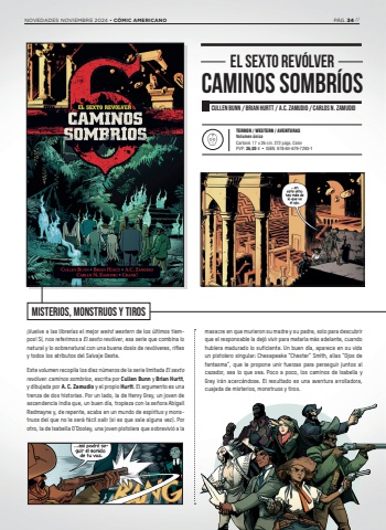 CULLEN BUNN / BRIAN HURTT / A.C. ZAMUDIO / CARLOS N. ZAMUDIOEL SEXTO REV%u00d3LVERCAMINOS SOMBR%u00cdOSTERROR / WESTERN / AVENTURASVolumen %u00fanicoCarton%u00e9. 17 x 26 cm. 272 p%u00e1gs. Color PVP: 36,00 %u20ac %u2022 ISBN: 978-84-679-7293-1MISTERIOS, MONSTRUOS Y TIROS%u00a1Vuelve a las librer%u00edas el mejor weird western de los %u00faltimos tiempos! S%u00ed, nos referimos a El sexto rev%u00f3lver, esa serie que combina lo natural y lo sobrenatural con una buena dosis de rev%u00f3lveres, rifles y todos los atributos del Salvaje Oeste. Este volumen recopila los diez n%u00fameros de la serie limitada El sexto rev%u00f3lver: caminos sombr%u00edos, escrita por Cullen Bunn y Brian Hurtt, y dibujada por A. C. Zamudio y el propio Hurtt. El argumento es una trenza de dos historias. Por un lado, la de Henry Grey, un joven de ascendencia india que, un buen d%u00eda, tropieza con la se%u00f1ora Abigail Redmayne y, de repente, acaba en un mundo de esp%u00edritus y monstruos del que no le ser%u00e1 f%u00e1cil salir (si es que sale alguna vez). Por otro, la de Isabella O%u2019Dooley, una joven pistolera que sobrevivi%u00f3 a la masacre en que murieron su madre y su padre, solo para descubrir que el responsable la dej%u00f3 vivir para matarla m%u00e1s adelante, cuando hubiera madurado lo suficiente. Un buen d%u00eda, aparece en su vida un pistolero singular: Chesapeake %u201cChester%u201d Smith, alias %u201cOjos de fantasma%u201d, que le propone unir fuerzas para perseguir juntos al cazador, sea lo que sea. Poco a poco, los caminos de Isabella y Grey ir%u00e1n acerc%u00e1ndose. El resultado es una aventura arrolladora, cuajada de misterios, monstruos y tiros.NOVEDADES NOVIEMBRE 2024 %u2022 C%u00d3MIC AMERICANO P%u00c1G. 34 //
