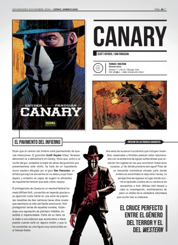 SCOTT SNYDER / DAN PANOSIANCANARYTERROR / WESTERNVolumen %u00fanicoCarton%u00e9. 17 x 26 cm. 168 p%u00e1gs. Color PVP: 27,00 %u20ac %u2022 ISBN: 978-84-679-7220-7EL PAVIMENTO DEL INFIERNODicen que el camino del infierno est%u00e1 pavimentado de buenas intenciones. El guionista Scott Snyder (Clear, Tenemos demonios) va a demostrarlo en Canary, t%u00edtulo que, junto a La noche del gul, completa la dupla de obras del guionista que presentaremos este oto%u00f1o. Se trata de un inquietante horror western dibujado por el gran Dan Panosian, un artista que aqu%u00ed se encuentra en su salsa y cuyo trazo %u00e1spero y siniestro es capaz de sugerir la atm%u00f3sfera de inquietante tensi%u00f3n que este c%u00f3mic respira.El protagonista de Canary es un marshal federal llamado William Holt, convertido en leyenda gracias a su aparici%u00f3n como h%u00e9roe en una serie de populares novelitas de diez centavos (esas dime novelsque asentaron el mito del Oeste americano). Holt protagoniz%u00f3 varias de aquellas novelas, forj%u00e1ndose una reputaci%u00f3n de pistolero infalible, imbatible e imperturbable. Parte de su fama se la debe a una m%u00e1scara que acostumbra a llevar puesta cuando est%u00e1 en alguna misi%u00f3n y que lo ha convertido en una figura muy reconocible en el Salvaje Oeste.Una serie de sucesos truculentos que incluyen incendios, asesinatos y filicidios parecen estar relacionados con la existencia de aguas subterr%u00e1neas que conectan los lugares en los que ocurrieron todos esos sucesos. %u00bfY de d%u00f3nde proviene ese agua? Pues de un manantial monta%u00f1oso situado justo donde anta%u00f1o se encontraba la vieja mina Canary. La perspectiva de regresar al lugar donde ocurri%u00f3 el episodio cumbre de su carrera le da escalofr%u00edos a Holt. William Holt llevar%u00e1 a cabo la investigaci%u00f3n, mostr%u00e1ndonos de paso un atisbo de la verdadera naturaleza que oculta tras su m%u00e1scara.PREVIEW EN LAS P%u00c1GINAS SIGUIENTESEL CRUCE PERFECTO ENTRE EL G%u00c9NERO DEL TERROR Y EL DEL WESTERNNOVEDADES NOVIEMBRE 2024 %u2022 C%u00d3MIC AMERICANO P%u00c1G. 41 //