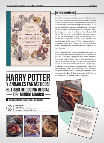 SARAH WALKER CARON / ELENA P. CRAIG / JODY REVENSONHARRY POTTERCINE / COCINAVolumen %u00fanicoCarton%u00e9. 20,3 x 25,4 cm. 224 p%u00e1gs. ColorPVP: 39,50 %u20ac %u2022 ISBN: 978-84-679-7029-6Una de las facetas que suele pasar desapercibida en el mundo de Harry Potter y de Animales fant%u00e1sticos es la culinaria, ilustrada perfectamente por el interminable desfile de platos que desfilan por los salones de Hogwarts. La comida es una parte importante en la vida de todo hechicero. Y no nos referimos solo a los suntuosos banquetes de Hogwarts, sino a los desayunos en casa de los t%u00edos de Harry, a la sopa de El Caldero Chorreante, o a esas cafeter%u00edas llenas de muggles a las que, de vez en cuando, acuden Ron, Harry y Hermione. Y mucho antes de que ellos nacieran, Newt Scamander hab%u00eda conocido a las %u201cbrujas cocineras%u201d Tina y Queenie Goldstein, y al pastelero nomaj Jacob Kowalski. En el curso de sus aventuras, Scamander prob%u00f3 platos de Nueva York, Inglaterra, Par%u00eds o Alemania. Ahora puedes descubrir el secreto de todas esas recetas en El libro de cocina oficial del Mundo M%u00e1gico, un recetario m%u00e1gico que te ense%u00f1ar%u00e1 a preparar la tarta salada de carne y cerveza del callej%u00f3n Diagon o los pasteles de chocolate en taza de las hermanas Goldstein. Se trata de una completa selecci%u00f3n de recetas de cocina que te ayudar%u00e1 a preparar paso a paso toda clase de platos, incluyendo recetas veganas, vegetarianas y sin gluten. Como guinda del pastel, una amplia recopilaci%u00f3n de an%u00e9cdotas de rodaje y de citas de tus personajes preferidos. Seas de dulce o de salado, si disfrutas con el universo de J. K. Rowling, este es tu recetario.Y ANIMALES FANT%u00c1STICOS:EL LIBRO DE COCINA OFICIALDEL MUNDO M%u00c1GICORECETARIO M%u00c1GICONOVEDADES NOVIEMBRE 2024 %u2022 LIBRO ILUSTRADO P%u00c1G. 46 //