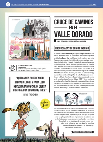 El franc%u00e9s Lewis Trondheim y el espa%u00f1ol Sergio Garc%u00eda son dos de los mejores autores de c%u00f3mic de la actualidad. El primero cre%u00f3 junto a Joann Sfar ese hito del c%u00f3mic moderno que es La Mazmorra, una mezcla divertid%u00edsima de humor, aventura, monstruos, fantas%u00eda %u00e9pica y Espada y Brujer%u00eda. El segundo ha ganado recientemente el Premio Nacional de Ilustraci%u00f3n en Espa%u00f1a, pero, adem%u00e1s, es uno de nuestros m%u00e1s brillantes dibujantes de historieta, como ha demostrado hace poco con El cielo en la cabeza, la novela gr%u00e1fica que dibuj%u00f3 sobre un guion de Antonio Altarriba (otro Premio Nacional, de c%u00f3mic en esta ocasi%u00f3n) y que contaba con la paleta gr%u00e1fica de Lola Moral, que es su colorista habitual. Trondheim y Garc%u00eda hab%u00edan colaborado juntos en la serie Les trois chemins, all%u00e1 por 2002. Y ahora vuelven a encontrarse (con Lola Moral como de nuevo colorista) en Cruce de caminos en el valle dorado, una serie de cuatro bellos cuentos interconectados en forma de c%u00f3mic, ideales para regalar a lectores menudos (y a aquellos que no lo sean tanto).Los personajes de estas cuatro historias se cruzan y se descruzan sin cesar, aunque a veces no se enteren de esos cruces y aunque cada uno de ellos cuente despu%u00e9s con su propia historia independiente, empezando por el ni%u00f1o que no quer%u00eda tener un gato y acabando con el presidente de gobierno que se dedicaba a cazar todos los monstruos habidos y por haber. El resultado es un despliegue de fantas%u00eda, humor, emoci%u00f3n, genio e ingenio, que nos divierte, emociona y sorprende a partes iguales, y en algunos momentos todo eso a la vez.ENCRUCIJADAS DE GENIO E INGENIOCRUCE DE CAMINOSLEWIS TRONDHEIM / SERGIO GARC%u00cdA / LOLA MORAL%u00c1LBUM ILUSTRADO / COFREVolumen %u00fanicoR%u00fastica con solapas. 20 x 20 cm. 128 p%u00e1gs (32 x 4). Color PVP: 34,95 %u20ac %u2022 ISBN: 978-84-679-7056-2EN ELVALLE DORADO%u201cQuer%u00edamos sorprender en cada libro, y para ello necesit%u00e1bamos crear cierta ruptura con los otros tres.%u201d%u2014 LEWIS TRONDHEIMA PARTIR DE3 A%u00d1OS PREVIEW EN LAS P%u00c1GINAS SIGUIENTESNOVEDADES NOVIEMBRE 2024 %u2022 ASTRONAVE P%u00c1G. 67 //