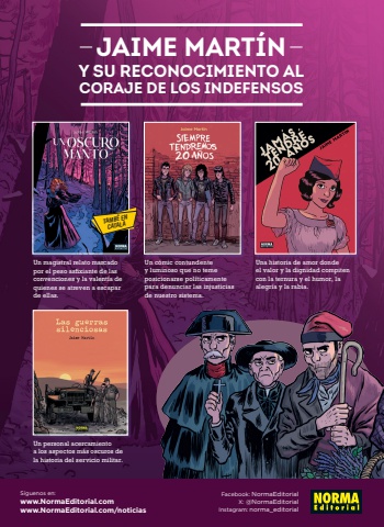 JAIME MART%u00cdNY SU RECONOCIMIENTO AL CORAJE DE LOS INDEFENSOSUn magistral relato marcado por el peso asfixiante de las convenciones y la valent%u00eda de quienes se atreven a escapar de ellas.Un c%u00f3mic contundente y luminoso que no teme posicionarse pol%u00edticamente para denunciar las injusticias de nuestro sistema.Una historia de amor donde el valor y la dignidad compiten con la ternura y el humor, la alegr%u00eda y la rabia.Un personal acercamiento a los aspectos m%u00e1s oscuros de la historia del servicio militar.S%u00edguenos en:www.NormaEditorial.comwww.NormaEditorial.com/noticiasFacebook: NormaEditorialX: @NormaEditorialInstagram: norma_editorialTAMB%u00c9 EN CATAL%u00c0