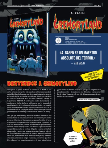 bienvenidos a gremorylandConsagrado al g%u00e9nero de terror, el barcelon%u00e9s A. Rasen es uno de los autores emergentes m%u00e1s populares e internacionales de la actualidad. Los lectores de sus obras, publicadas originalmente en formato digital, se cuentan por millones. Debut%u00f3 con gran %u00e9xito en 2017 con la serie de terror psicol%u00f3gico Melvina%u2019s Therapy en la plataforma WEBTOON. A continuaci%u00f3n realiz%u00f3 GremoryLand, un escalofriante slasher de horror adolescente que ha alcanzado la exorbitante cifra de 24 millones de lecturas en ingl%u00e9s y en espa%u00f1ol, y cuya primera parte en formato impreso presentamos ahora en un impactante libro de 356 p%u00e1ginas a todo color que incluye un dosier gr%u00e1fico repleto de bocetos y curiosidades del proceso de trabajo. Pero %u00bfde qu%u00e9 trata GremoryLand? Pues cuenta la historia de seis excompa%u00f1eros de escuela que reciben una invitaci%u00f3n para ser los primeros visitantes de GremoryLand, un parque tem%u00e1tico de terror que promete una experiencia %u00fanica y espeluznante. El problema es que, una vez cruzan sus puertas, los visitantes se quedan atrapados en el interior del parque. Para salir deber%u00e1n superar obst%u00e1culos que pondr%u00e1n a prueba su cordura, obligados a luchar contra toda clase miedos y contra sus propios demonios si quieren sobrevivir. El resultado es una sucesi%u00f3n de escenas realmente perturbadoras que, como en todo buen slasher que se precie, contienen una dosis generosa de sangre y v%u00edsceras, pero en las que tambi%u00e9n subyacen tres preguntas que sirven de eje a todo el c%u00f3mic: %u00bfqui%u00e9n est%u00e1 a los mandos del parque? %u00bfPor qu%u00e9 ha elegido a estos seis adolescentes %u2014de car%u00e1cteres muy diferentes%u2014 como conejillos de Indias? %u00bfLograr%u00e1n salir con vida del parque o acabar%u00e1n convertidos en carne picada?TERRORPrimer volumen de dosCarton%u00e9. 16 x 24 cm. 356 p%u00e1gs. Color PVP: 29,95 %u20ac %u2022 ISBN: 978-84-679-7187-3PREVIEW EN LAS P%u00c1GINAS SIGUIENTES%u00abA. RASEN ES UN MAESTRO ABSOLUTO DEL TERROR.%u00bb%u2014 THE BEAT%u00a1M%u00c1S DE 24 MILLONES DE VISITAS EN WEBTOON!NOVEDADES OCTUBRE 2024 %u2022 C%u00d3MIC EUROPEO P%u00c1G. 21 //