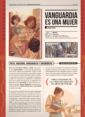 POETA, NADADORA, VANGUARDISTA Y SINSOMBREROMar%u00eda de la Concepci%u00f3n M%u00e9ndez y Cuesta, m%u00e1s conocida como Concha M%u00e9ndez, fue una poeta vanguardista que, como muchas mujeres de su generaci%u00f3n, se gan%u00f3 a pulso un lugar en la historia del feminismo, pero perdi%u00f3 su puesto en los manuales de literatura espa%u00f1ola. Exiliada en M%u00e9xico a consecuencia de la Guerra Civil, periodistas y acad%u00e9micos le ped%u00edan con frecuencia que respondiese a cuestionarios acerca de su relaci%u00f3n con algunos de los integrantes de la Generaci%u00f3n del 27: Luis Bu%u00f1uel (con quien mantuvo un noviazgo de juventud), Manuel Altolaguirre (con quien estuvo casada hasta 1944), Federico Garc%u00eda Lorca o Luis Cernuda(de quienes fue amiga). Pero en el curso de aquellas entrevistas nadie le preguntaba por ella misma ni por su obra o sus recuerdos. Su nieta Paloma se dio cuenta de esta omisi%u00f3n y decidi%u00f3 tomar cartas en el asunto animando a su abuela a grabar unas memorias en un magnet%u00f3fono, memorias que luego transcribi%u00f3 y edit%u00f3 en un volumen titulado Memorias habladas, memorias armadas (1988), un punto de partida que ha servido de inspiraci%u00f3n a la historietista Clara de Frutos para realizar Vanguardia es una mujer, novela gr%u00e1fica que recrea la vida de Concha M%u00e9ndez haciendo especial hincapi%u00e9 en su relaci%u00f3n con las Sinsombrero, el grupo de mujeres, escritoras y artistas, que pertenece por derecho propio a la Generaci%u00f3n del 27, pero que rara vez se ha asomado a los manuales de arte, pensamiento o literatura. Una necesaria obra de 144 p%u00e1ginas espl%u00e9ndidamente escritas y dibujadas, que traza una panor%u00e1mica a todo color, amplia e intimista, en torno a una figura clave, una generaci%u00f3n %u00fanica y una %u00e9poca irrepetible.CLARA DE FRUTOSVANGUARDIAES UNA MUJERBIOGRAF%u00cdAVolumen %u00fanicoCarton%u00e9. 19 x 26 cm. 144 p%u00e1gs. Color PVP: 19,50 %u20ac %u2022 ISBN: 978-84-679-7219-1PREVIEW EN LAS P%u00c1GINAS SIGUIENTESOBRA GANADORA DE LA 1%u00aa BECA DE CREACI%u00d3NEL ARTE DE VOLARNOVEDADES OCTUBRE 2024 %u2022 PRODUCCI%u00d3N PROPIA P%u00c1G. 3 //