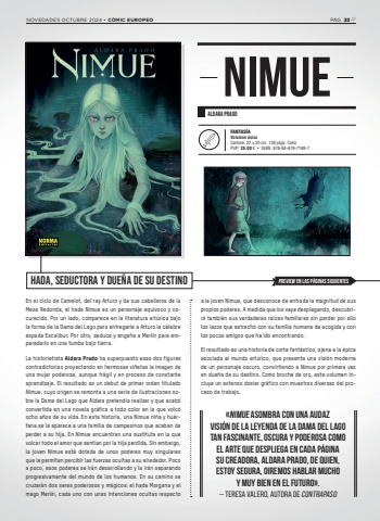 ALDARA PRADOFANTAS%u00cdAVolumen %u00fanicoCarton%u00e9. 22 x 30 cm. 128 p%u00e1gs. ColorPVP: 28,00 %u20ac %u2022 ISBN: 978-84-679-7189-7HADA, SEDUCTORA Y DUE%u00d1A DE SU DESTINONIMUEPREVIEW EN LAS P%u00c1GINAS SIGUIENTESEn el ciclo de Camelot, del rey Arturo y de sus caballeros de la Mesa Redonda, el hada Nimue es un personaje equ%u00edvoco y oscurecido. Por un lado, comparece en la literatura art%u00farica bajo la forma de la Dama del Lago para entregarle a Arturo la c%u00e9lebre espada Excalibur. Por otro, seduce y enga%u00f1a a Merl%u00edn para emparedarlo en una tumba bajo tierra. La historietista Aldara Prado ha superpuesto esas dos figuras contradictorias proyectando en hermosas vi%u00f1etas la imagen de una mujer poderosa, aunque fr%u00e1gil y en proceso de constante aprendizaje. El resultado es un debut de primer orden titulado Nimue, cuyo origen se remonta a una serie de ilustraciones sobre la Dama del Lago que Aldara pretend%u00eda realizar y que acab%u00f3 convertida en una novela gr%u00e1fica a todo color en la que volc%u00f3 ocho a%u00f1os de su vida. En esta historia, una Nimue ni%u00f1a y hu%u00e9rfana se le aparece a una familia de campesinos que acaban de perder a su hija. En Nimue encuentran una sustituta en la que volcar todo el amor que sent%u00edan por la hija perdida. Sin embargo, la joven Nimue est%u00e1 dotada de unos poderes muy singulares que le permiten percibir las fuerzas ocultas a su alrededor. Poco a poco, esos poderes se ir%u00e1n desarrollando y la ir%u00e1n separando progresivamente del mundo de los humanos. En su camino se cruzar%u00e1n dos seres poderosos y m%u00e1gicos: el hada Morgana y el mago Merl%u00edn, cada uno con unas intenciones ocultas respecto a la joven Nimue, que desconoce de entrada la magnitud de sus propios poderes. A medida que los vaya desplegando, descubrir%u00e1 tambi%u00e9n sus verdaderas ra%u00edces familiares sin perder por ello los lazos que estrech%u00f3 con su familia humana de acogida y con los pocos amigos que ha ido encontrando. El resultado es una historia de corte fant%u00e1stico, ajena a la %u00e9pica asociada al mundo art%u00farico, que presenta una visi%u00f3n moderna de un personaje oscuro, convirtiendo a Nimue por primera vez en due%u00f1a de su destino. Como broche de oro, este volumen incluye un extenso dosier gr%u00e1fico con muestras diversas del proceso de trabajo.%u00abNimue asombra con una audaz visi%u00f3n de la leyenda de la Dama del Lago tan fascinante, oscura y poderosa como el arte que despliega en cada p%u00e1gina su creadora, Aldara Prado, de quien, estoy segura, oiremos hablar mucho y muy bien en el futuro%u00bb.%u2014 TERESA VALERO, AUTORA DE CONTRAPASONOVEDADES OCTUBRE 2024 %u2022 C%u00d3MIC EUROPEO P%u00c1G. 33 //