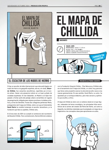 DAVID MARTOVIAJES / ARTEVolumen %u00fanico. Carton%u00e9. 17 x 24 cm. 96 p%u00e1gs. Color %u2022 PVP: 24,95 %u20ac ISBN ED. CASTELLANO: 978-84-679-6163-8ISBN ED. EUSKERA: 978-84-679-6164-5EL ESCULTOR DE LOS NUDOS DE HIERROEL MAPA DECHILLIDAPREVIEW EN LAS P%u00c1GINAS SIGUIENTESSi hay un escultor de talla internacional cuya obra est%u00e1 ligada con nudos de hierro a la geograf%u00eda espa%u00f1ola, ese es, sin duda, Eduardo Chillida. Sus conjuntos escult%u00f3ricos, repartidos por el mundo entero, tienen una presencia notoria en un buen pu%u00f1ado de ciudades espa%u00f1olas. En San Sebasti%u00e1n, en Madrid o en Gij%u00f3n han pasado a formar parte del paisaje urbano convertidos en lugares de peregrinaci%u00f3n obligada para viajeros proclives a la belleza art%u00edstica y al mal de Stendhal. A esas dos categor%u00edas pertenece Marta, protagonista de El mapa de Chillida, c%u00f3mic con que el historietista David Marto ha rendido homenaje al escultor donostiarra y a la fundaci%u00f3n que lleva su apellido, Chillida Leku.El 10 de enero de 2024 se cumpli%u00f3 el centenario del nacimiento de Eduardo Chillida. Para conmemorarlo, Norma Editorial colabora con la Fundaci%u00f3n Eduardo Chillida - Pilar Belzunce y Chillida Leku en el lanzamiento de El mapa de Chillida, un c%u00f3mic muy personal que tiene como prop%u00f3sito acercar la obra del escultor vasco a las nuevas generaciones. En ese sentido, David Marto, su autor, ha apostado por un enfoque did%u00e1ctico, pero m%u00e1s cercano y optimista que erudito y cr%u00edtico. El mapa de Chillida se cierra con un extenso dosier en el que figuran, ordenados de forma cronol%u00f3gica, los principales hitos escult%u00f3ricos de la carrera del creador del Peine del Viento, as%u00ed como su biograf%u00eda, los distintos materiales que ha empleado a lo largo de su trayectoria o los conceptos clave para aproximarse a su obra. TAMBI%u00c9N EN EUSKERANOVEDADES OCTUBRE 2024 %u2022 PRODUCCI%u00d3N PROPIA P%u00c1G. 39 //