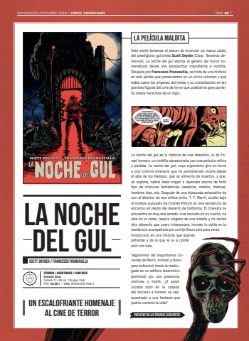 TERROR / AVENTURAS / FANTAS%u00cdAVolumen %u00fanicoCarton%u00e9. 17 x 26 cm. 176 p%u00e1gs. ColorPVP: 28,00 %u20ac %u2022 ISBN: 978-84-679-7222-1LA PEL%u00cdCULA MALDITAEste oto%u00f1o tenemos el placer de anunciar un nuevo c%u00f3mic del prestigioso guionista Scott Snyder (Clear, Tenemos demonios). La noche del gul aborda el g%u00e9nero del horror sobrenatural desde una perspectiva inquietante e ins%u00f3lita. Dibujada por Francesco Francavilla, se trata de una historia en seis partes que presentamos en un %u00fanico volumen y que habla sobre los or%u00edgenes del miedo y su cristalizaci%u00f3n en las grandes figuras del cine de terror que pueblan la gran pantalla desde hace m%u00e1s de un siglo. La noche del gul es la historia de una obsesi%u00f3n, la de Forest Innman, un cin%u00e9filo obsesionado con una pel%u00edcula m%u00edtica y perdida, La noche del gul, cuyo argumento gira en torno a una criatura milenaria que ha permanecido oculta desde el alba de los tiempos, que se alimenta de muertos, y que, se supone, habr%u00eda dado origen a leyendas acerca de todo tipo de criaturas fant%u00e1sticas: vampiros, zombis, momias, hombres lobo, etc. Despu%u00e9s de una b%u00fasqueda exhaustiva da con el director de esa m%u00edtica cinta, T. F. Merrit, oculto bajo el nombre supuesto de Charles Patrick en una residencia de ancianos en medio del desierto de California. El cineasta se encuentra en muy mal estado: vive recluido en su cuarto, no sale de la cama, respira ox%u00edgeno de una botella y no recibe otro alimento que suero intravenoso. Innman lo visita en la residencia acompa%u00f1ado por su hijo Orson solo para verse involucrado en una historia que apenas entiende y de la que le va a costar salir con vida. Seguiremos las angustiosas correr%u00edas de Merrit, Innman y Orson para sobrevivir hasta la madrugada en un edificio laber%u00edntico dominado por una presencia ominosa y hostil. %u00bfO quiz%u00e1 suceda todo en la cabeza del anciano e Innman se vea arrastrado a una fantas%u00eda que podr%u00eda costarle la vida? SCOTT SNYDER / FRANCESCO FRANCAVILLALA NOCHEDEL GULNOVEDADES OCTUBRE 2024 %u2022 C%u00d3MIC AMERICANO P%u00c1G. 45 // UN ESCALOFRIANTE HOMENAJE AL CINE DE TERROR PREVIEW EN LAS P%u00c1GINAS SIGUIENTES