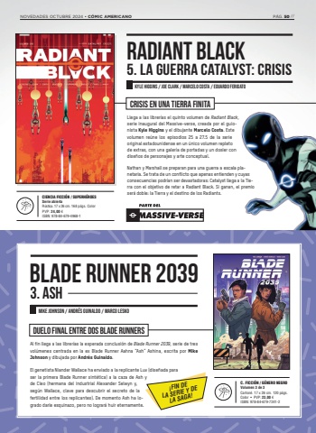 CIENCIA FICCI%u00d3N / SUPERH%u00c9ROESSerie abiertaR%u00fastica. 17 x 26 cm. 168 p%u00e1gs. Color PVP: 24,00 %u20acISBN: 978-84-679-4968-1C. FICCI%u00d3N / G%u00c9NERO NEGROVolumen 3 de 3Carton%u00e9. 17 x 26 cm. 120 p%u00e1gs. Color %u2022 PVP: 23,00 %u20ac ISBN: 978-84-679-7241-2DUELO FINAL ENTRE DOS BLADE RUNNERSAl fin llega a las librer%u00edas la esperada conclusi%u00f3n de Blade Runner 2039, serie de tres vol%u00famenes centrada en la ex Blade Runner Aahna %u201cAsh%u201d Ashina, escrita por Mike Johnson y dibujada por Andr%u00e9s Guinaldo. El genetista Niander Wallace ha enviado a la replicante Luv (dise%u00f1ada para ser la primera Blade Runner sint%u00e9tica) a la caza de Ash y de Cleo (hermana del industrial Alexander Selwyn y, seg%u00fan Wallace, clave para descubrir el secreto de la fertilidad entre los replicantes). De momento Ash ha logrado darle esquinazo, pero no lograr%u00e1 huir eternamente.CRISIS EN UNA TIERRA FINITAKYLE HIGGINS / JOE CLARK / MARCELO COSTA / EDUARDO FERIGATOLlega a las librer%u00edas el quinto volumen de Radiant Black, serie inaugural del Massive-verse, creada por el guionista Kyle Higgins y el dibujante Marcelo Costa. Este volumen re%u00fane los episodios 25 a 27.5 de la serie original estadounidense en un %u00fanico volumen repleto de extras, con una galer%u00eda de portadas y un dosier con dise%u00f1os de personajes y arte conceptual. Nathan y Marshall se preparan para una guerra a escala planetaria. Se trata de un conflicto que apenas entienden y cuyas consecuencias podr%u00edan ser devastadoras: Catalyst llega a la Tierra con el objetivo de retar a Radiant Black. Si ganan, el premio ser%u00e1 doble: la Tierra y el destino de los Radiants.RADIANT BLACK5. LA GUERRA CATALYST: CRISIS3. ASHBLADE RUNNER 2039MIKE JOHNSON / ANDR%u00c9S GUINALDO / MARCO LESKO%u00a1FIN DE LA SERIE Y DE LA SAGA!NOVEDADES OCTUBRE 2024 %u2022 C%u00d3MIC AMERICANO P%u00c1G. 50 //