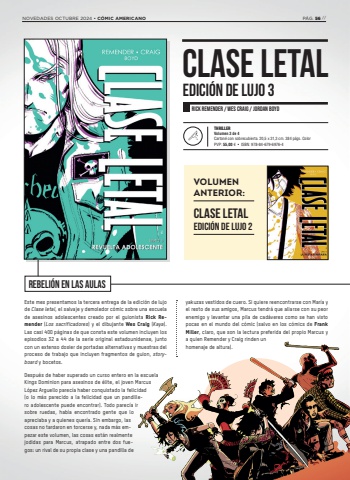 RICK REMENDER / WES CRAIG / JORDAN BOYDCLASE LETALEDICI%u00d3N DE LUJO 3THRILLERVolumen 3 de 4Carton%u00e9 con sobrecubierta. 20,5 x 31,3 cm. 384 p%u00e1gs. Color PVP: 55,00 %u20ac %u2022 ISBN: 978-84-679-6976-4REBELI%u00d3N EN LAS AULASVOLUMENANTERIOR:CLASE LETALEDICI%u00d3N DE LUJO 2Este mes presentamos la tercera entrega de la edici%u00f3n de lujo de Clase letal, el salvaje y demoledor c%u00f3mic sobre una escuela de asesinos adolescentes creado por el guionista Rick Remender (Los sacrificadores) y el dibujante Wes Craig (Kaya). Las casi 400 p%u00e1ginas de que consta este volumen incluyen los episodios 32 a 44 de la serie original estadounidense, junto con un extenso dosier de portadas alternativas y muestras del proceso de trabajo que incluyen fragmentos de guion, storyboard y bocetos. Despu%u00e9s de haber superado un curso entero en la escuela Kings Dominion para asesinos de %u00e9lite, el joven Marcus L%u00f3pez Arguello parec%u00eda haber conquistado la felicidad (o lo m%u00e1s parecido a la felicidad que un pandillero adolescente puede encontrar). Todo parec%u00eda ir sobre ruedas, hab%u00eda encontrado gente que lo apreciaba y a quienes quer%u00eda. Sin embargo, las cosas no tardaron en torcerse y, nada m%u00e1s empezar este volumen, las cosas est%u00e1n realmente jodidas para Marcus, atrapado entre dos fuegos: un rival de su propia clase y una pandilla de yakuzas vestidos de cuero. Si quiere reencontrarse con Mar%u00eda y el resto de sus amigos, Marcus tendr%u00e1 que aliarse con su peor enemigo y levantar una pila de cad%u00e1veres como se han visto pocas en el mundo del c%u00f3mic (salvo en los c%u00f3mics de Frank Miller, claro, que son la lectura preferida del propio Marcus y a quien Remender y Craig rinden un homenaje de altura).NOVEDADES OCTUBRE 2024 %u2022 C%u00d3MIC AMERICANO P%u00c1G. 56 //