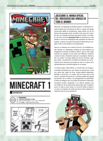 VIDEOJUEGOS9 vol%u00famenes publicados en Jap%u00f3nR%u00fastica con sobrecubierta. 11,5 x 17,5 cm. 192 p%u00e1gs. BNPVP: 9,00 %u20ac %u2022 ISBN: 978-84-679-7098-2%u00a1DESCUBRE EL MANGA OFICIAL DEL VIDEOJUEGO QUE ARRASA EN TODO EL MUNDO!Minecraft, el videojuego de Mojang Studios, ha definido la industria desde que se estrenara en 2011 y, a pesar del tiempo transcurrido desde su lanzamiento, sigue siendo uno de los t%u00edtulos m%u00e1s populares entre el p%u00fablico m%u00e1s joven de la casa. Por ello, era cuesti%u00f3n de tiempo que diera el salto a la vi%u00f1eta. Es as%u00ed como el artista Kazuyoshi Seto se aproxima con este manga a uno de los videojuegos m%u00e1s populares de todos los tiempos, creando una historia inspirada en Minecraft por completo, tanto a nivel est%u00e9tico como argumental.Seto es un veterano de la revista Corocoro, con m%u00faltiples series basadas en videojuegos lanzadas en esta cabecera de Shogakukan enfocada al p%u00fablico infantil, que ha sido hogar reciente, por ejemplo, de las series de Pok%u00e9mon y Splatoony hasta ha visto a Doraemon pasar por sus p%u00e1ginas. Gracias a ello, ha creado un manga repleto de acci%u00f3n, divertido y %u00e1gil, que utiliza a la perfecci%u00f3n la est%u00e9tica de bloques tan caracter%u00edstica de la franquicia sin perder por ello ni un %u00e1pice de la expresividad que uno podr%u00eda esperar en un manga. La historia sigue a Niko White, un chaval lleno de energ%u00eda y curiosidad procedente de una familia de aventureros. Tiene una marca que, seg%u00fan se dice, otorga poderes especiales. Decidido a encontrar a su padre, sale en busca del fin del mundo, corriendo aventuras en un universo repleto de lugares alucinantes. Por el camino, los protagonistas se enfrentar%u00e1n a todos los peligros que uno puede encontrase en Minecraft, incluyendo zombis, esqueletos o los m%u00edticos creepers. Eso sin olvidarnos de los particulares personajes que lo pueblan, como un ninja un poco torpe a la hora de utilizar el sigilo o un chico con aspecto de zombi que busca c%u00f3mo deshacer la maldici%u00f3n que le da esa apariencia. KAZUYOSHI SETOMINECRAFT 1NOVEDADES OCTUBRE 2024 %u2022 MANGA P%u00c1G. 57 //