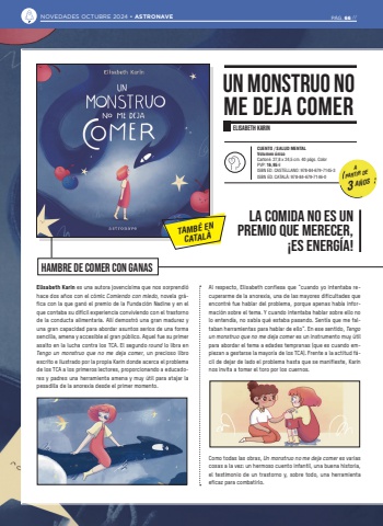 Elisabeth Karin es una autora jovenc%u00edsima que nos sorprendi%u00f3 hace dos a%u00f1os con el c%u00f3mic Comiendo con miedo, novela gr%u00e1fica con la que gan%u00f3 el premio de la Fundaci%u00f3n Nadine y en el que contaba su dif%u00edcil experiencia conviviendo con el trastorno de la conducta alimentaria. All%u00ed demostr%u00f3 una gran madurez y una gran capacidad para abordar asuntos serios de una forma sencilla, amena y accesible al gran p%u00fablico. Aquel fue su primer asalto en la lucha contra los TCA. El segundo round lo libra en Tengo un monstruo que no me deja comer, un precioso libro escrito e ilustrado por la propia Karin donde acerca el problema de los TCA a los primeros lectores, proporcionando a educadores y padres una herramienta amena y muy %u00fatil para atajar la pesadilla de la anorexia desde el primer momento.Al respecto, Elisabeth confiesa que %u201ccuando yo intentaba recuperarme de la anorexia, una de las mayores dificultades que encontr%u00e9 fue hablar del problema, porque apenas hab%u00eda informaci%u00f3n sobre el tema. Y cuando intentaba hablar sobre ello no lo entend%u00eda, no sab%u00eda qu%u00e9 estaba pasando. Sent%u00eda que me faltaban herramientas para hablar de ello%u201d. En ese sentido, Tengo un monstruo que no me deja comer es un instrumento muy %u00fatil para abordar el tema a edades tempranas (que es cuando empiezan a gestarse la mayor%u00eda de los TCA). Frente a la actitud f%u00e1cil de dejar de lado el problema hasta que se manifieste, Karin nos invita a tomar el toro por los cuernos. Como todas las obras, Un monstruo no me deja comer es varias cosas a la vez: un hermoso cuento infantil, una buena historia, el testimonio de un trastorno y, sobre todo, una herramienta eficaz para combatirlo.HAMBRE DE COMER CON GANASUN MONSTRUO NOME DEJA COMERELISABETH KARINCUENTO / SALUD MENTALVolumen %u00fanicoCarton%u00e9. 27,8 x 24,5 cm. 40 p%u00e1gs. Color PVP: 16,95 %u20ac ISBN ED. CASTELLANO: 978-84-679-7145-3ISBN ED. CATAL%u00c0: 978-84-679-7146-0A PARTIR DE3 A%u00d1OS TAMB%u00c9 ENCATAL%u00c0LA COMIDA NO ES UN PREMIO QUE MERECER, %u00a1ES ENERG%u00cdA!NOVEDADES OCTUBRE 2024 %u2022 ASTRONAVE P%u00c1G. 66 //