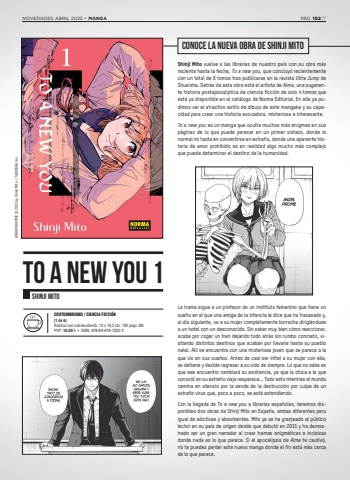 Shinji Mito vuelve a las librer%u00edas de nuestro pa%u00eds con su obra m%u00e1s reciente hasta la fecha, To a new you, que concluy%u00f3 recientemente con un total de 6 tomos tras publicarse en la revista Ultra Jump de Shueisha. Detr%u00e1s de esta obra est%u00e1 el artista de Alma, una sugerente historia postapocal%u00edptica de ciencia ficci%u00f3n de solo 4 tomos que est%u00e1 ya disponible en el cat%u00e1logo de Norma Editorial. En ella ya pudimos ver el atractivo estilo de dibujo de este mangaka y su capacidad para crear una historia evocadora, misteriosa e interesante.To a new you es un manga que oculta muchos m%u00e1s enigmas en sus p%u00e1ginas de lo que puede parecer en un primer vistazo, donde lo normal no tarda en convertirse en extra%u00f1o, donde una aparente historia de amor prohibido es en realidad algo mucho m%u00e1s complejo que puede determinar el destino de la humanidad.La trama sigue a un profesor de un instituto femenino que tiene un sue%u00f1o en el que una amiga de la infancia le dice que ha fracasado y, al d%u00eda siguiente, ve a su mujer completamente borracha dirigi%u00e9ndose a un hotel con un desconocido. Sin saber muy bien c%u00f3mo reaccionar, acaba por coger un tren dejando todo atr%u00e1s sin rumbo concreto, visitando distintos destinos que acaban por llevarle hasta su pueblo natal. All%u00ed se encuentra con una misteriosa joven que se parece a la que vio en sus sue%u00f1os. Antes de casi ser infiel a su mujer con ella, se detiene y decide regresar a su vida de siempre. Lo que no sabe es que ese encuentro cambiar%u00e1 su existencia, ya que la chica a la que conoci%u00f3 en su extra%u00f1o viaje reaparece... Todo esto mientras el mundo camina en silencio por la senda de la destrucci%u00f3n por culpa de un extra%u00f1o virus que, poco a poco, se est%u00e1 extendiendo.Con la llegada de To a new you a librer%u00edas espa%u00f1olas, tenemos disponibles dos obras de Shinji Mito en Espa%u00f1a, ambas diferentes pero igual de adictivas y absorbentes. Mito ya se ha granjeado al p%u00fablico lector en su pa%u00eds de origen desde que debut%u00f3 en 2015 y ha demostrado ser un gran narrador al crear tramas enigm%u00e1ticas e incisivas donde nada es lo que parece. Si el apocalipsis de Alma te cautiv%u00f3, no te puedes perder este nuevo manga donde el fin est%u00e1 m%u00e1s cerca de lo que parece.CONOCE LA NUEVA OBRA DE SHINJI MITOCOSTUMBRISMO / CIENCIA FICCI%u00d3N(1 de 6)R%u00fastica con sobrecubierta. 13 x 18,2 cm. 192 p%u00e1gs. BN PVP: 10,00 %u20ac %u2022 ISBN: 978-84-679-7522-2SHINJI MITOTO A NEW YOU 1ATARASHII KIMIE %u00a9 2021 by Shinji Mito / SHUEISHA Inc.NOVEDADES ABRIL 2025 %u2022 MANGA P%u00c1G. 102 //