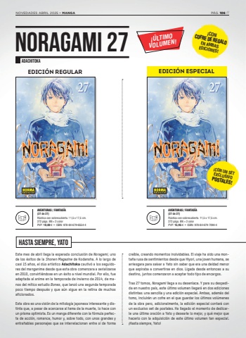 Este mes de abril llega la esperada conclusi%u00f3n de Noragami, uno de los %u00e9xitos de la Shonen Magazine de Kodansha. A lo largo de casi 15 a%u00f1os, el d%u00fao art%u00edstico Adachitoka cautiv%u00f3 a los seguidores del manganime desde que esta obra comenzara a serializarse en 2010, convirti%u00e9ndose en un %u00e9xito a nivel mundial. Por ello, fue adaptada al anime en la temporada de invierno de 2014, de manos del m%u00edtico estudio Bones, que lanz%u00f3 una segunda temporada poco tiempo despu%u00e9s y que a%u00fan sigue en la retina de muchos aficionados.Esta obra es una visi%u00f3n de la mitolog%u00eda japonesa interesante y distinta que, a pesar de acercarse al tema de la muerte, lo hace con un prisma optimista. Es un manga diferente con la f%u00f3rmula perfecta de acci%u00f3n, romance, humor y, sobre todo, con unos grandes y entra%u00f1ables personajes que se interrelacionan entre s%u00ed de forma cre%u00edble, creando momentos inolvidables. El viaje ha sido una monta%u00f1a rusa de sentimientos desde que Hiyori, una joven humana, se arriesgara para salvar a Yato sin saber que era una deidad menor que aspiraba a convertirse en dios. Ligada desde entonces a su destino, juntos comenzaron a aceptar todo tipo de encargos.Tras 27 tomos, Noragami llega a su desenlace. Y para su despedida en nuestro pa%u00eds, este %u00faltimo volumen llegar%u00e1 en dos ediciones distintas: una sencilla y una edici%u00f3n especial. Ambas, adem%u00e1s del tomo, incluir%u00e1n un cofre en el que guardar los %u00faltimos vol%u00famenes de la obra pero, adicionalmente, la edici%u00f3n especial contar%u00e1 con un exclusivo set de postales. Ha llegado el momento de dedicarle una %u00faltima oraci%u00f3n a Yato y desearle lo mejor, y qu%u00e9 mejor que hacerlo con la adquisici%u00f3n de este %u00faltimo volumen tan especial. %u00a1Hasta siempre, Yato!ADACHITOKANORAGAMI 27AVENTURAS / FANTAS%u00cdA(27 de 27)R%u00fastica con sobrecubierta. 11,5 x 17,5 cm. 272 p%u00e1gs. BN + 2 color PVP: 10,00 %u20ac %u2022 ISBN: 978-84-679-6554-4AVENTURAS / FANTAS%u00cdA(27 de 27)R%u00fastica con sobrecubierta. 11,5 x 17,5 cm. 272 p%u00e1gs. BN + 2 color PVP: 15,95 %u20ac %u2022 ISBN: 978-84-679-7094-4HASTA SIEMPRE, YATOEDICI%u00d3N REGULAR EDICI%u00d3N ESPECIAL%u00a1CONCOFRE DE REGALO EN AMBAS EDICIONES!%u00a1%u00daLTIMOVOLUMEN!%u00a1CON UN SETEXCLUSIVOPOSTALES!NOVEDADES ABRIL 2025 %u2022 MANGA P%u00c1G. 106 //