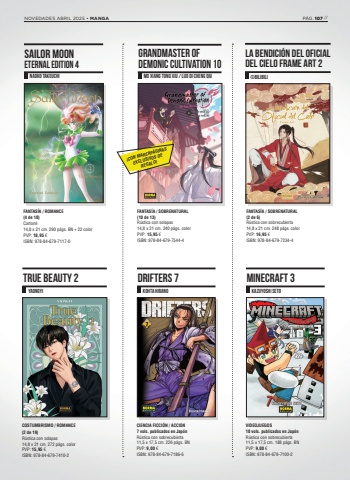 FANTAS%u00cdA / ROMANCE(4 de 10)Carton%u00e914,8 x 21 cm. 290 p%u00e1gs. BN + 22 color PVP: 18,95 %u20ac ISBN: 978-84-679-7117-0FANTAS%u00cdA / SOBRENATURAL(2 de 6)R%u00fastica con sobrecubierta 14,8 x 21 cm. 248 p%u00e1gs. color PVP: 16,95 %u20ac ISBN: 978-84-679-7234-4NAOKO TAKEUCHI %u00a9BILIBILIFANTAS%u00cdA / SOBRENATURAL(10 de 13)R%u00fastica con solapas 14,8 x 21 cm. 240 p%u00e1gs. color PVP: 15,95 %u20ac ISBN: 978-84-679-7544-4GRANDMASTER OF DEMONIC CULTIVATION 10MO XIANG TONG XIU / LUO DI CHENG QIULA BENDICI%u00d3N DEL OFICIAL DEL CIELO FRAME ART 2SAILOR MOON ETERNAL EDITION 4COSTUMBRISMO / ROMANCE(2 de 19)R%u00fastica con solapas 14,8 x 21 cm. 272 p%u00e1gs. colorPVP: 15,95 %u20ac ISBN: 978-84-679-7410-2TRUE BEAUTY 2 DRIFTERS 7YAONGYI KOHTA HIRANOCIENCIA FICCI%u00d3N / ACCION7 vols. publicados en Jap%u00f3nR%u00fastica con sobrecubierta11,5 x 17,5 cm. 226 p%u00e1gs. BNPVP: 9,00 %u20ac ISBN: 978-84-679-7186-6VIDEOJUEGOS10 vols. publicados en Jap%u00f3nR%u00fastica con sobrecubierta 11,5 x 17,5 cm. 188 p%u00e1gs. BNPVP: 9,00 %u20ac ISBN: 978-84-679-7100-2MINECRAFT 3KAZUYOSHI SETO%u00a1CON MARCAP%u00c1GINAS EXCLUSIVOS DE REGALO!NOVEDADES ABRIL 2025 %u2022 MANGA P%u00c1G. 107 //