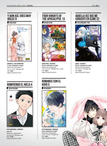 ROMANCE / COSTUMBRISMO11 vols. publicados en Jap%u00f3nR%u00fastica con sobrecubierta11,5 x 17,5 cm. 188 p%u00e1gs. BN PVP: 9,00 %u20ac ISBN: 978-84-679-7475-1ISEKAI / FANTAS%u00cdA28 vols. publicados en Jap%u00f3nR%u00fastica con sobrecubierta 13 x 18,2 cm. 192 p%u00e1gs. BN PVP: 9,00 %u20ac ISBN: 978-84-679-7348-8KUJIRA ANAN TAIKI KAWAKAMI / FUSEAVENTURAS / FANTAS%u00cdA20 vols. publicados en Jap%u00f3nR%u00fastica con sobrecubierta 11,5 x 17,5 cm. 188 p%u00e1gs. BN + 2 colorPVP: 9,00 %u20ac ISBN: 978-84-679-7351-8FOUR KNIGHTS OF THE APOCALYPSE 13NAKABA SUZUKIAQUELLA VEZ QUE MECONVERT%u00cd EN SLIME 22 Y AUN AS%u00cd, ERES MUY DULCE 9COSTUMBRISMO / ROMANCE(4 de 14)R%u00fastica con sobrecubierta 13 x 18,2 cm. 208 p%u00e1gs. colorPVP: 13,00 %u20ac ISBN: 978-84-679-7160-6ROMPIENDO EL HIELO 4ROMANCE CON EL RAYO 5KOCHA AGASAWA RIN MIKIMOTOCOSTUMBRISMO / ROMANCE6 vols. publicados en Jap%u00f3nR%u00fastica con sobrecubierta11,5 x 17,5 cm. 176 p%u00e1gs. BNPVP: 9,00 %u20ac ISBN: 978-84-679-7428-7NOVEDADES ABRIL 2025 %u2022 MANGA P%u00c1G. 110 //
