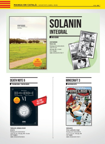 MANGA EN CATAL%u00c0 %u2022 NOVETATS ABRIL 2025 P%u00c1G. 111 // THRILLER / CI%u00c8NCIA-FICCI%u00d3(6 de 6)R%u00fastega amb sobrecoberta 14,8 x 21 cm. 416 p%u00e0g. BN + 8 colorPVP: 18,95 %u20ac ISBN: 978-84-679-6150-8VIDEOJOCS10 vol. publicats al Jap%u00f3R%u00fastega amb sobrecoberta 11,5 x 17,5 cm. 192 p%u00e0g. BNPVP: 9,00 %u20ac ISBN: 978-84-679-7107-1DEATH NOTE 6 MINECRAFT 3TSUGUMI OHBA / TAKESHI OBATA KAZUYOSHI SETOCOSTUMISMEVolum %u00fanicR%u00fastega amb sobrecoberta14,8 x 21 cm. 464 p%u00e0g. BN + 4 colorPVP: 17,95 %u20ac ISBN: 978-84-679-7501-7SOLANININIO ASANO%u00daLTIMVOLUM!INTEGRAL
