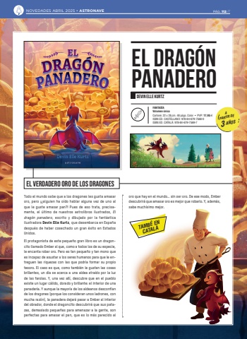 Todo el mundo sabe que a los dragones les gusta amasar oro, pero %u00a1%u00bfalguien ha o%u00eddo hablar alguna vez de uno al que le guste amasar pan?! Pues de eso trata, precisamente, el %u00faltimo de nuestros astrolibros ilustrados, El drag%u00f3n panadero, escrito y dibujado por la fant%u00e1stica ilustradora Devin Elle Kurtz, que desembarca en Espa%u00f1a despu%u00e9s de haber cosechado un gran %u00e9xito en Estados Unidos. El protagonista de este peque%u00f1o gran libro es un dragoncito llamado Ember al que, como a todos los de su especie, le encanta robar oro. Pero es tan peque%u00f1o y tan mono que es incapaz de asustar a los seres humanos para que le entreguen las riquezas con las que podr%u00eda formar su propio tesoro. El caso es que, como tambi%u00e9n le gustan las cosas brillantes, un d%u00eda se acerca a una aldea atra%u00eddo por la luz de las farolas. Y, una vez all%u00ed, descubre que en el pueblo existe un lugar c%u00e1lido, dorado y brillante: el interior de una panader%u00eda. Y aunque la mayor%u00eda de los aldeanos desconf%u00edan de los dragones (porque los consideran unos ladrones, con mucha raz%u00f3n), la panadera dejar%u00e1 pasar a Ember al interior del obrador, donde el dragoncito descubrir%u00e1 que sus patazas, demasiado peque%u00f1as para amenazar a la gente, son perfectas para amasar el pan, que es lo m%u00e1s parecido al oro que hay en el mundo%u2026 sin ser oro. De ese modo, Ember descubrir%u00e1 que amasar oro es mejor que robarlo. Y, adem%u00e1s, sabe much%u00edsimo mejor.EL VERDADERO ORO DE LOS DRAGONES EL DRAG%u00d3N PANADERODEVIN ELLE KURTZFANTAS%u00cdAVolumen %u00fanicoCarton%u00e9. 22 x 28,cm. 48 p%u00e1gs. Color %u2022 PVP: 17,95 %u20acISBN ED. CASTELLANO: 978-84-679-7568-0ISBN ED. CATAL%u00c0: 978-84-679-7569-7A PARTIR DE3 A%u00d1OS TAMB%u00c9 EN CATAL%u00c0NOVEDADES ABRIL 2025 %u2022 ASTRONAVE P%u00c1G. 112 //
