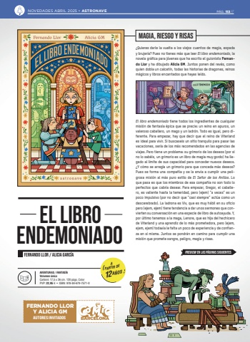 MAGIA, RIESGO Y RISAS%u00bfQuieres darle la vuelta a los viejos cuentos de magia, espada y brujer%u00eda? Pues no tienes m%u00e1s que leer El libro endemoniado, la novela gr%u00e1fica para j%u00f3venes que ha escrito el guionista Fernando Llor y ha dibujado Alicia GM. Juntos ponen del rev%u00e9s, como quien dobla un calcet%u00edn, todas las historias de dragones, reinos m%u00e1gicos y libros encantados que hayas le%u00eddo.El libro endemoniado tiene todos los ingredientes de cualquier misi%u00f3n de fantas%u00eda %u00e9pica que se precie: un reino en apuros, un valeroso caballero, un mago y un ladr%u00f3n. Todo es igual, pero diferente. Para empezar, hay que decir que el reino de Viterland es ideal para vivir. Si buscaseis un sitio tranquilo para pasar las vacaciones, ser%u00eda de los m%u00e1s recomendados en las agencias de viajes. Pero tiene un problema: su grimorio de los deseos (por si no lo sab%u00e9is, un grimorio es un libro de magia muy gordo) ha llegado al l%u00edmite de sus capacidad para conceder nuevos deseos. %u00bfY c%u00f3mo se arregla un grimorio para que conceda m%u00e1s deseos? Pues se forma una compa%u00f1%u00eda y se la env%u00eda a cumplir una peligrosa misi%u00f3n al m%u00e1s puro estilo de El Se%u00f1or de los Anillos. Lo que pasa es que los miembros de esa compa%u00f1%u00eda no son todo lo perfectos que cabr%u00eda desear. Para empezar, Gregor, el caballero, es valiente hasta la temeridad, pero (ejem) %u201ca veces%u201d es un poco impulsivo (por no decir que %u201ccasi siempre%u201d act%u00faa como un descerebrado). La ladrona es Viv, que es muy h%u00e1bil en su oficio pero (ejem, ejem) tiene tendencia a dar unos sermones que convierten su conversaci%u00f3n en una especie de libro de autoayuda. Y, por %u00faltimo tenemos a la maga, Lenore, que es hija del hechicero de Viterland y una aprendiz de lo m%u00e1s prometedora, pero (ejem, ejem, ejem) todav%u00eda le falta un poco de experiencia y de confianza en s%u00ed misma. Juntos se pondr%u00e1n en camino para cumplir una misi%u00f3n que promete sangre, peligro, magia y risas.FERNANDO LLOR / ALICIA GARC%u00cdAEL LIBROENDEMONIADOPREVIEW EN LAS P%u00c1GINAS SIGUIENTESAVENTURAS / FANTAS%u00cdAVolumen %u00fanicoCarton%u00e9. 17,5 x 26 cm. 120 p%u00e1gs. Color PVP: 22,95 %u20ac %u2022 ISBN: 978-84-679-7571-0A PARTIR DE12 A%u00d1OS AUTORES INVITADOSFERNANDO LLORY ALICIA GMNOVEDADES ABRIL 2025 %u2022 ASTRONAVE P%u00c1G. 113 //