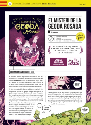 El diccionari defineix la geoda com el buit d%u2019una roca, entapissat d%u2019una subst%u00e0ncia generalment cristal%u00b7litzada. Per%u00f2 l%u2019autora J%u00falia Rubau li dona un sentit distint, m%u00e0gic, divertit i fabul%u00f3s, en la novel%u00b7la gr%u00e0fica per a joves El misteri de la geoda rosada, obra guanyadora del premi Carnet Jove de C%u00f2mic 2024 que atorga l%u2019Ag%u00e8ncia Catalana de la Joventut. Al llarg de m%u00e9s de 100 p%u00e0gines, la J%u00falia ens explica la hist%u00f2ria de tres nens, el Nil, la Lara i el D%u00eddac, que viuen en un poble tranquil anomenat Montarbor%u00e7. Es tracta d%u2019un poblet tan tranquil que als nostres tres protagonistes els resulta d%u2019all%u00f2 m%u00e9s avorrit, sobretot quan s%u00f3n vacances, quan tenen tot el temps del m%u00f3n per a viure aventures de veritat, d%u2019aquestes que normalment no succeeixen en la realitat. O que no succe%u00efen fins al dia en qu%u00e8, rescatant un capgr%u00f2s atrapat en una tolla, la Lara assisteix a un succ%u00e9s m%u00e0gic. La ra%u00f3 %u00e9s que, una vegada alliberat, la bestiola es converteix en una granota gaireb%u00e9 a l%u2019instant, com per art de m%u00e0gia. Com %u00e9s possible? La Lara comen%u00e7ar%u00e0 a investigar i, a part d%u2019omplir-se de fang, entrar%u00e0 en contacte amb una comunitat de granotes molt peculiar, les habilitats de les quals tenen relaci%u00f3 amb una pedra caiguda del cel: la misteriosa geoda rosada. Ser%u00e0 el principi d%u2019una hist%u00f2ria d%u2019estiu que, primer, estrenyer%u00e0 els lla%u00e7os d%u2019amistat entre els tres protagonistes i, segon, ampliar%u00e0 els l%u00edmits de la imaginaci%u00f3 de tots els seus lectors.GEOMAGIA CAIGUDA DEL CELEL MISTERI DE LAGEODA ROSadaJ%u00daLIA RUBAUFANTASIA / AVENTURESVolum %u00fanicCarton%u00e9. 17 x 24 cm. 104 p%u00e0g. Color PVP: 18,95 %u20ac %u2022 ISBN: 978-84-679-7570-3A PARTIR DE9 ANYS GUANYADORA DEL PREMI CARNET JOVE DE C%u00d2MIC 2024DE L%u2019AG%u00c8NCIA CATALANA DE LA JOVENTUTAUTORA INVITADAJ%u00daLIARUBAUNOVETATS ABRIL 2025 %u2022 ASTRONAVE %u2022 EDICI%u00d3 EN CATAL%u00c0 P%u00c0G. 119 //