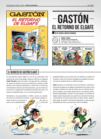 DELAF (SEG%u00daN LA OBRA DE FRANQUIN)GAST%u00d3NEL RETORNO DE ELGAFEHUMOR / CL%u00c1SICOVolumen de lectura independienteCarton%u00e9. 22 x 29,5 cm. 48 p%u00e1gs. Color PVP: 17,00 %u20ac %u2022 ISBN: 978-84-679-7647-2EL REGRESO DE GAST%u00d3N ELGAFEEl inconformista Gaston Elgafe es uno de los personajes m%u00e1s queridos del c%u00f3mic francobelga. Creado en 1957 por el magistral Andr%u00e9 Franquin, genio del humor y del gag absurdo y disparatado, Gaston se mantuvo vivo tras la muerte de su creador en 1997 gracias a las sucesivas reediciones y, sobre todo, al cari%u00f1o que le manifestaron decenas de miles de lectores, que se miraban en %u00e9l como en un espejo que les mostraba la persona que eran, con todas sus imperfecciones, y no a la que les gustar%u00eda ser. Atendiendo a esa popularidad, en 2022, cuando se cumpl%u00edan 25 a%u00f1os de la muerte de Franquin, el sello Dupuis decidi%u00f3 relanzar la serie con otro autor y, para ello, la puso en las competent%u00edsimas manos del quebequ%u00e9s Delaf, que se mantuvo fiel a la est%u00e9tica y al esp%u00edritu de Franquin y firm%u00f3 con El retorno de Elgafe una magn%u00edfica continuaci%u00f3n que ha vendido m%u00e1s de un mill%u00f3n de copias. Delaf reproduce con exactitud el trazo de Franquin y mantiene la estructura de gags de una p%u00e1gina caracter%u00edstica de la serie. Como novedad, incorpora una serie de tramas que se contin%u00faan de p%u00e1gina en p%u00e1gina y que acaban dando forma a una historia perfectamente desarrollada y cerrada. En esta ocasi%u00f3n, los inventos de Elgafe acaban desquiciando al conjunto de la redacci%u00f3n de Spirou y amenazando con poner punto final a la m%u00edtica revista. %u00bfSer%u00e1 Elgafe capaz de revertir la situaci%u00f3n? Desc%u00fabrelo en este puchero burbujeante de risas y caos que es El retorno de Elgafe.NOVEDADES ABRIL 2025 %u2022 C%u00d3MIC EUROPEO P%u00c1G. 14 //