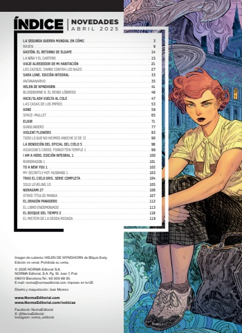 NOVEDADESABRIL 2025Imagen de cubierta: HELEN DE WYNDHORN de Bilquis Evely.Edici%u00f3n no venal. Prohibida su venta.%u00a9 2025 NORMA Editorial S.A. NORMA Editorial, S.A. Pg. St. Joan 7, Pral. 08010 Barcelona.Tel.: 93 303 68 20. E-mail: norma@normaeditorial.com. Impreso en la UE.Dise%u00f1o y maquetaci%u00f3n: Joan Morenowww.NormaEditorial.comwww.NormaEditorial.com/noticiasFacebook: NormaEditorialX: @NormaEditorialInstagram: norma_editorialLA SEGUNDA GUERRA MUNDIAL EN C%u00d3MIC .............................................. 3RAVEN.................................................................................. 9GAST%u00d3N. EL RETORNO DE ELGAFE ...................................................... 14LA NI%u00d1A Y EL CARTERO ................................................................. 15VIAJE ALREDEDOR DE MI HABITACI%u00d3N ................................................. 21LOS ZAZOUS. SWING CONTRA LOS NAZIS ............................................... 27SARA LONE. EDICI%u00d3N INTEGRAL........................................................ 33ANTANANARIVO ........................................................................ 35HELEN DE WYNDHORN.................................................................. 41BLOODBORNE 6. EL REINO L%u00d3BREGO .................................................. 46HACK/SLASH VUELTA AL COLE ......................................................... 47 LAS CASAS DE LOS IMP%u00cdOS............................................................. 53GONE .................................................................................. 59SPACE-MULLET........................................................................ 65ELIXIR ................................................................................. 71GUNSLINGERS ......................................................................... 77VIOLENT FLOWERS .................................................................... 83TODO LO QUE NO HICIMOS ANOCHE (2 DE 3) ............................................ 90LA BENDICI%u00d3N DEL OFICIAL DEL CIELO 5 ............................................... 98ASSASSIN%u2019S CREED. FORGOTTEN TEMPLE 1 ............................................ 99I AM A HERO. EDICI%u00d3N INTEGRAL 1 ................................................... 100RURIDRAGON 1 ....................................................................... 101TO A NEW YOU 1...................................................................... 102MY SECRETLY HOT HUSBAND 1........................................................ 103TRAS EL CIELO GRIS. SERIE COMPLETA ............................................... 104SOLO LEVELING 10.................................................................... 105NORAGAMI 27......................................................................... 106OTROS T%u00cdTULOS MANGA ............................................................... 107EL DRAG%u00d3N PANADERO ............................................................... 112EL LIBRO ENDEMONIADO .............................................................. 113EL BOSQUE DEL TIEMPO 2 ............................................................ 118EL MISTERI DE LA GEODA ROSADA .................................................... 119