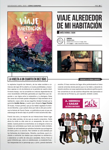 AUR%u00c9LIE HERROU / SAGARVIAJE ALREDEDORDE MI HABITACI%u00d3NCOMEDIAVolumen %u00fanicoCarton%u00e9. 23,5 x 31,2 cm. 72 p%u00e1gs. Color PVP: 24,00 %u20ac %u2022 ISBN: 978-84-679-7616-8LA VUELTA A UN CUARTO EN DIEZ D%u00cdASLa explosiva irrupci%u00f3n de internet y de las redes sociales a comienzos del siglo XXI ha abierto un mundo posibilidades y maravillas a apenas un clic de distancia en la pantalla de nuestro m%u00f3vil. Al mismo tiempo, nos ha convertido en criaturas dependientes de unas necesidades artificiales generadas por algoritmos que responden a una l%u00f3gica entre lo matem%u00e1tico y lo alien%u00edgena. Estas dos caras de la moneda quedan reflejadas en Viaje alrededor de mi habitaci%u00f3n, nuevo c%u00f3mic de ese magn%u00edfico t%u00e1ndem formado por la guionista Aur%u00e9lie Herrou y nuestro gran dibujante Sagar Forni%u00e9s(El museo, A brazo partido), que ya nos hab%u00edan regalado El s%u00edndrome de Stendhal, y que vuelven ahora por todo lo alto para contarnos la historia de Franck Clavier, un publicista en paro al que una sobrecarga de tensi%u00f3n deja sin port%u00e1til ni m%u00f3vil durante diez d%u00edas. Franck vive solo y la mayor%u00eda de sus interacciones tienen lugar en las redes sociales, de las que es usuario compulsivo. Hasta ahora ha vivido su vida como en un escaparate, de cara a los dem%u00e1s. Cuando pierde la conectividad, se ve obligado a llenar su tiempo con actividades que hasta ese momento hab%u00eda olvidado. Tambi%u00e9n se ver%u00e1 asaltado por extra%u00f1as fantas%u00edas que protagoniza %u00e9l mismo junto a su exnovia. Pero tambi%u00e9n se ver%u00e1 asaltado por los fantasmas de intelectuales, fil%u00f3sofos, escritores, que lo invitar%u00e1n a confrontar los miedos que comprimen su existencia y a abandonar un estilo de vida poco saludable. Herrou firma un guion intimista que, como un caleidoscopio, va revelando facetas inesperadas de un personaje que, a priori, parec%u00eda bastante anodino. El trazo nervioso de Sagar afina perfectamente el tema creando armon%u00edas donde parec%u00eda que no las hab%u00eda y elevando la tensi%u00f3n emotiva con esas explosiones de potencia gr%u00e1fica que lo han convertido en uno de nuestros dibujantes m%u00e1s apreciados al otro lado de los Pirineos (y, por supuesto, tambi%u00e9n a este).AUTORES INVITADOSA. HERROUY SAGARPREVIEW EN LAS P%u00c1GINAS SIGUIENTESNOVEDADES ABRIL 2025 %u2022 C%u00d3MIC EUROPEO P%u00c1G. 21 //