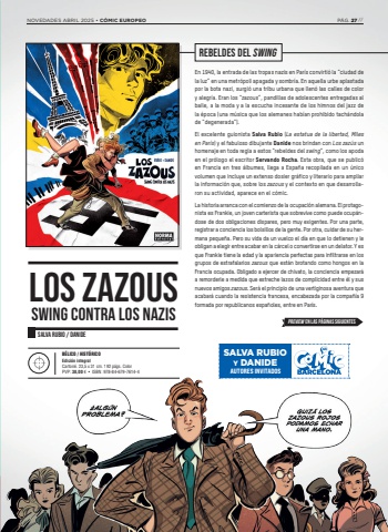 En 1940, la entrada de las tropas nazis en Par%u00eds convirti%u00f3 la %u201cciudad de la luz%u201d en una metr%u00f3poli apagada y sombr%u00eda. En aquella urbe aplastada por la bota nazi, surgi%u00f3 una tribu urbana que llen%u00f3 las calles de color y alegr%u00eda. Eran los %u201czazous%u201d, pandillas de adolescentes entregadas al baile, a la moda y a la escucha incesante de los himnos del jazz de la %u00e9poca (una m%u00fasica que los alemanes hab%u00edan prohibido tach%u00e1ndola de %u201cdegenerada%u201d). El excelente guionista Salva Rubio (La estatua de la libertad, Miles en Par%u00eds) y el fabuloso dibujante Danide nos brindan con Los zaz%u00fas un homenaje en toda regla a estos %u201crebeldes del swing%u201d, como los apoda en el pr%u00f3logo el escritor Servando Rocha. Esta obra, que se public%u00f3 en Francia en tres %u00e1lbumes, llega a Espa%u00f1a recopilada en un %u00fanico volumen que incluye un extenso dosier gr%u00e1fico y literario para ampliar la informaci%u00f3n que, sobre los zazous y el contexto en que desarrollaron su actividad, aparece en el c%u00f3mic. La historia arranca con el comienzo de la ocupaci%u00f3n alemana. El protagonista es Frankie, un joven carterista que sobrevive como puede ocup%u00e1ndose de dos obligaciones dispares, pero muy exigentes. Por una parte, registrar a conciencia los bolsillos de la gente. Por otra, cuidar de su hermana peque%u00f1a. Pero su vida da un vuelco el d%u00eda en que lo detienen y le obligan a elegir entre acabar en la c%u00e1rcel o convertirse en un delator. Y es que Frankie tiene la edad y la apariencia perfectas para infiltrarse en los grupos de estrafalarios zazous que est%u00e1n brotando como hongos en la Francia ocupada. Obligado a ejercer de chivato, la conciencia empezar%u00e1 a remorderle a medida que estreche lazos de complicidad entre %u00e9l y sus nuevos amigos zazous. Ser%u00e1 el principio de una vertiginosa aventura que acabar%u00e1 cuando la resistencia francesa, encabezada por la compa%u00f1%u00eda 9 formada por republicanos espa%u00f1oles, entre en Par%u00eds.REBELDES DEL SWINGPREVIEW EN LAS P%u00c1GINAS SIGUIENTESB%u00c9LICO / HIST%u00d3RICOEdici%u00f3n integralCarton%u00e9. 23,5 x 31 cm. 192 p%u00e1gs. Color PVP: 38,00 %u20ac %u2022 ISBN: 978-84-679-7614-4SALVA RUBIO / DANIDELOS ZAZOUSSWING CONTRA LOS NAZISAUTORES INVITADOSSALVA RUBIOY DANIDENOVEDADES ABRIL 2025 %u2022 C%u00d3MIC EUROPEO P%u00c1G. 27 //