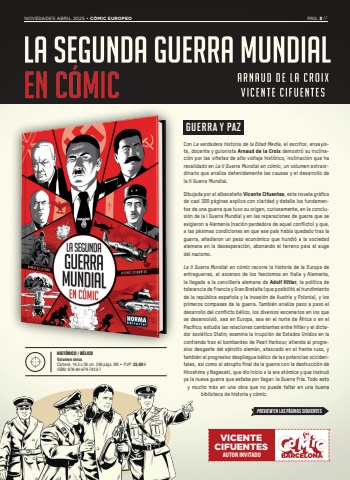 Con La verdadera historia de la Edad Media, el escritor, ensayista, docente y guionista Arnaud de la Croix demostr%u00f3 su inclinaci%u00f3n por las vi%u00f1etas de alto voltaje hist%u00f3rico, inclinaci%u00f3n que ha revalidado en La II Guerra Mundial en c%u00f3mic, un volumen extraordinario que analiza detenidamente las causas y el desarrollo de la II Guerra Mundial. Dibujada por el albacete%u00f1o Vicente Cifuentes, esta novela gr%u00e1fica de casi 300 p%u00e1ginas explica con claridad y detalle los fundamentos de una guerra que tuvo su origen, curiosamente, en la conclusi%u00f3n de la I Guerra Mundial y en las reparaciones de guerra que se exigieron a Alemania (naci%u00f3n perdedora de aquel conflicto) y que, a las p%u00e9simas condiciones en que ese pa%u00eds hab%u00eda quedado tras la guerra, a%u00f1adieron un peso econ%u00f3mico que hundi%u00f3 a la sociedad alemana en la desesperaci%u00f3n, abonando el terreno para el auge del nazismo. La II Guerra Mundial en c%u00f3mic recorre la historia de la Europa de entreguerras, el ascenso de los fascismos en Italia y Alemania, la llegada a la canciller%u00eda alemana de Adolf Hitler, la pol%u00edtica de tolerancia de Francia y Gran Breta%u00f1a (que posibilit%u00f3 el hundimiento de la rep%u00fablica espa%u00f1ola y la invasi%u00f3n de Austria y Polonia), y los primeros compases de la guerra. Tambi%u00e9n analiza paso a paso el desarrollo del conflicto b%u00e9lico, los diversos escenarios en los que se desenvolvi%u00f3, sea en Europa, sea en el norte de %u00c1frica o en el Pac%u00edfico; estudia las relaciones cambiantes entre Hitler y el dictador sovi%u00e9tico Stalin; examina la irrupci%u00f3n de Estados Unidos en la contienda tras el bombardeo de Pearl Harbour; atiende al progresivo desgaste del ej%u00e9rcito alem%u00e1n, atascado en el frente ruso, y tambi%u00e9n al progresivo despliegue b%u00e9lico de las potencias occidentales, as%u00ed como al abrupto final de la guerra con la destrucci%u00f3n de Hiroshima y Nagasaki, que dio inicio a la era at%u00f3mica y que insinu%u00f3 ya la nueva guerra que estaba por llegar: la Guerra Fr%u00eda. Todo esto y mucho m%u00e1s en una obra que no puede faltar en una buena biblioteca de historia y c%u00f3mic.HIST%u00d3RICO / B%u00c9LICOVolumen %u00fanico Carton%u00e9. 19,5 x 26 cm. 296 p%u00e1gs. BN %u2022 PVP: 35,00 %u20acISBN: 978-84-679-7613-7PREVIEW EN LAS P%u00c1GINAS SIGUIENTESGUERRA Y PAZAUTOR INVITADOVICENTE CIFUENTESNOVEDADES ABRIL 2025 %u2022 C%u00d3MIC EUROPEO P%u00c1G. 3 //