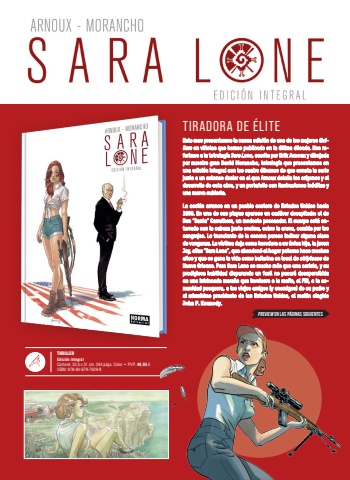 Este mes presentamos la nueva edici%u00f3n de uno de los mejores thrillers en vi%u00f1etas que hemos publicado en la %u00faltima d%u00e9cada. Nos referimos a la tetralog%u00eda Sara Lone, escrita por Erik Arnoux y dibujada por nuestro gran David Morancho, tetralog%u00eda que presentamos en una edici%u00f3n integral con los cuatro %u00e1lbumes de que consta la serie junto a un extenso dosier en el que Arnoux detalla los or%u00edgenes y el desarrollo de esta obra, y un portafolio con ilustraciones in%u00e9ditas y una nueva cubierta. La acci%u00f3n arranca en un pueblo costero de Estados Unidos hacia 1960. En una de sus playas aparece un cad%u00e1ver decapitado: el de Ben %u201cSanta%u201d Carruthers, un modesto pescaador. El cuerpo est%u00e1 enterrado con la cabeza justo encima, sobre la arena, comida por los cangrejos. Lo truculento de la escena parece indicar alguna clase de venganza. La v%u00edctima deja como heredera a su %u00fanica hija, la joven Joy, alias %u201cSara Lone%u201d, que abandon%u00f3 el hogar paterno hace muchos a%u00f1os y que se gana la vida como bailarina en local de striptease de Nueva Orleans. Pero Sara Lone es mucho m%u00e1s que una corista, y su prodigiosa habilidad disparando un fusil no pasar%u00e1 desapercibida en una intrincada mara%u00f1a que involucra a la mafia, al FBI, a la comunidad pesquera, a los viejos amigos (y enemigos) de su padre y al mism%u00edsimo presidente de los Estados Unidos, el reci%u00e9n elegido John F. Kennedy.THRILLEREdici%u00f3n integral Carton%u00e9. 23,5 x 31 cm. 264 p%u00e1gs. Color %u2022 PVP: 49,95 %u20acISBN: 978-84-679-7629-8PREVIEW EN LAS P%u00c1GINAS SIGUIENTESTIRADORA DE %u00c9LITENOVEDADES ABRIL 2025 %u2022 C%u00d3MIC EUROPEO P%u00c1G. 33 //
