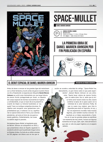 DANIEL WARREN JOHNSONSPACE-MULLETCIENCIA FICCI%u00d3N / HUMORVolumen %u00fanicoR%u00fastica con solapas. 17 x 26 cm. 232 p%u00e1gs. Bitono PVP: 29,50 %u20ac %u2022 ISBN: 978-84-679-7645-8EL DEBUT ESPACIAL DE DANIEL WARREN JOHNSONAntes de darse a conocer en las grandes ligas del mainstreamcon La flota fantasma y mucho antes de ganar el premio Eisner con Do a Powerbomb!, el espectacular dibujante Daniel Warren Johnson se curti%u00f3 como historietista con una larga historia de ciencia ficci%u00f3n protagonizada por Jonah, un desertor del cuerpo espacial de marines reconvertido en fugitivo y contrabandista, al que un buen d%u00eda se le presenta la ocasi%u00f3n de limpiar su historial haci%u00e9ndole un %u201cpeque%u00f1o%u201d favor a un antiguo compa%u00f1ero de armas. Su objetivo ser%u00e1 recuperar unas grabaciones comprometedoras que, si salieran a la luz, significar%u00edan la ruptura total entre la Tierra y sus colonias planetarias, as%u00ed como el inicio de una guerra a escala gal%u00e1ctica. Evidentemente, las cosas no saldr%u00e1n seg%u00fan lo previsto. As%u00ed empieza Space-Mullet, la trepidante serie de Warren Johnson se autopublic%u00f3 en 2012 y que presentamos ahora en Espa%u00f1a siguiendo la excelente edici%u00f3n que ha publicado Image Comics en Estados Unidos. Se trata de un s%u00f3lido volumen de 232 p%u00e1ginas con bitono azul en las que la acci%u00f3n se sucede a velocidad de v%u00e9rtigo. %u201cSpace-Mullet fue, b%u00e1sicamente, un gran lienzo sobre el que pude experimentar%u201d, declar%u00f3 Warren Johnson en una entrevista. %u201cQuer%u00eda hacer c%u00f3mics de ciencia ficci%u00f3n, pero no sab%u00eda c%u00f3mo. Eso s%u00ed, sab%u00eda que la %u00fanica forma ser%u00eda hacerlo todos los d%u00edas. Quer%u00eda combinar la %u00e9pica de la space opera con la intimidad de la serie televisiva Firefly. S%u00e9 que no suena muy original, pero hice lo imposible para darle mi impronta, mi voz, y fue una experiencia incre%u00edble. Hubo muchas l%u00e1grimas, pero tambi%u00e9n muchas victorias%u201d. El resultado es un tebeo sorprendente y fren%u00e9tico en el que las grandes peleas se equilibran con momentos de risa y llanto, incluso con algunos momentos en los que, ejem, ejem, descubriremos lo que vale un rollo de papel higi%u00e9nico en el espacio exterior.PREVIEW EN LAS P%u00c1GINAS SIGUIENTESLA PRIMERA OBRA DE DANIEL WARREN JOHNSON POR FIN PUBLICADA EN ESPA%u00d1ANOVEDADES ABRIL 2025 %u2022 C%u00d3MIC AMERICANO P%u00c1G. 65 //