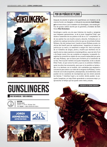 Despu%u00e9s de abordar el g%u00e9nero de superh%u00e9roes con Cloaked y el de ciencia ficci%u00f3n con Navigator, el dibujante barcelon%u00e9s Jordi Armengol se lanza ahora a por el western con Gunslingers, una novela gr%u00e1fica de grueso calibre escrita por el guionista y fundador de Dark Horse Mike Richardson. Gunslingers cuenta una de esas historias de muerte y venganza que traspasan generaciones, la de la joven Josephine Fuller, que asiste al asesinato de sus padres el d%u00eda de su 12.%u00ba cumplea%u00f1os. La de sus padres fue una muerte casual y absurda, tiroteados por un pu%u00f1ado de cowboys borrachos entre los que se encontraba Andrew McGeary, hijo del cacique local. Cuando el joven McGeary acuda a la oficina del sheriff para dar explicaciones, Josephine se tomar%u00e1 la justicia por su mano y lo asesinar%u00e1 a sangre fr%u00eda. Ser%u00e1 el principio de un torbellino de sangre, plomo y muerte que mantiene vivo el esp%u00edritu de los viejos westerns cinematogr%u00e1ficos, sean de John Ford o de Sergio Leone. Una vez cumplida su venganza, la peque%u00f1a Josephine se convertir%u00e1 en objeto de una cacer%u00eda implacable por parte del viejo McGeary, que la busca para lincharla por el asesinato de su hijo. Pero la joven recibir%u00e1 una ayuda inesperada, la de su abuelo Ethan Fuller, al que nunca ha visto y que es un pistolero infalible a quien los a%u00f1os han encanecido, pero que no ha perdido su testarudez ni su destreza con el rev%u00f3lver, dos cualidades que emplear%u00e1 a conciencia para salvar a su nieta de la venganza de McGeary. Juntos iniciar%u00e1n una huida sangrienta y desesperada, escondi%u00e9ndose como pueden de los cazadores de recompensas que les vienen pisando los talones. Y mientras huyen y se ocultan donde pueden, la peque%u00f1a Josephine y el viejo Ethan aprender%u00e1n a conocerse mejor y a aprovechar el tiempo que les queda como nieta y abuelo.POR UN PU%u00d1ADO DE PLOMOPREVIEW EN LAS P%u00c1GINAS SIGUIENTESWESTERNVolumen %u00fanicoCarton%u00e9. 17 x 26 cm. 128 p%u00e1gs. Color PVP: 25,00 %u20ac %u2022 ISBN: 978-84-679-7553-6MIKE RICHARDSON / JORDI ARMENGOLGUNSLINGERSAUTOR INVITADOJORDIARMENGOLNOVEDADES ABRIL 2025 %u2022 C%u00d3MIC AMERICANO P%u00c1G. 77 //