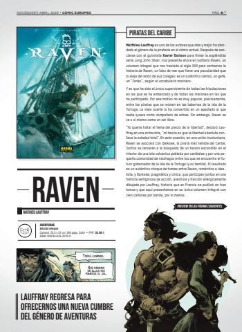 Matthieu Lauffray es uno de los autores que m%u00e1s y mejor ha abordado el g%u00e9nero de la pirater%u00eda en el c%u00f3mic actual. Despu%u00e9s de asociarse con el guionista Xavier Dorison para firmar la espl%u00e9ndida serie Long John Silver, nos presenta ahora en solitario Raven, un volumen integral que nos traslada al siglo XVII para contarnos la historia de Raven, un lobo de mar que tiene una peculiaridad que lo aleja del resto de sus colegas: es un aut%u00e9ntico cenizo, un gaf%u00e9, un %u201cJon%u00e1s%u201d, seg%u00fan el vocabulario marinero. Y es que ha sido el %u00fanico superviviente de todas las tripulaciones en las que se ha embarcado y de todas las misiones en las que ha participado. Por ese motivo no es muy popular, precisamente, entre los piratas que se re%u00fanen en las tabernas de la isla de la Tortuga. La mala suerte lo ha convertido en un apestado al que nadie quiere como compa%u00f1ero de armas. Sin embargo, Raven se ve a s%u00ed mismo como un ser libre. %u201cYo quer%u00eda tratar el tema del precio de la libertad%u201d, declar%u00f3 Lauffray en una entrevista, %u201cmi teor%u00eda es que la libertad absoluta conlleva la soledad total%u201d. En esta ocasi%u00f3n, en una uni%u00f3n involuntaria, Raven se asociar%u00e1 con Darksee, la pirata m%u00e1s temida del Caribe. Juntos se lanzar%u00e1n a la b%u00fasqueda de un tesoro escondido en el interior de una isla volc%u00e1nica poblada por can%u00edbales y por una peque%u00f1a comunidad de n%u00e1ufragos entre los que se encuentra el futuro gobernador de la isla de la Tortuga (y su familia). El resultado es un aut%u00e9ntico choque de trenes entre Raven, rom%u00e1ntico e idealista, y Darksee, pragm%u00e1tica y c%u00ednica, que participan juntos en una historia vertiginosa de acci%u00f3n, aventura y traici%u00f3n en%u00e9rgicamente dibujada por Lauffray, historia que en Francia se public%u00f3 en tres tomos y que aqu%u00ed presentamos en un %u00fanico volumen integral con cien ca%u00f1ones por banda, por lo menos.PIRATAS DEL CARIBEMATHIEU LAUFFRAYRAVENAVENTURASEdici%u00f3n integral Carton%u00e9. 23,5 x 31 cm. 204 p%u00e1gs. Color %u2022 PVP: 35,00 %u20acISBN: 978-84-679-7612-0LAUFFRAY REGRESA PARA OFRECERNOS UNA NUEVA CUMBRE DEL G%u00c9NERO DE AVENTURASPREVIEW EN LAS P%u00c1GINAS SIGUIENTESNOVEDADES ABRIL 2025 %u2022 C%u00d3MIC EUROPEO P%u00c1G. 9 //