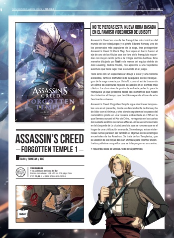 NO TE PIERDAS ESTA NUEVA OBRA BASADA EN EL FAMOSO VIDEOJUEGO DE UBISOFTAssassin%u2019s Creed es una de las franquicias m%u00e1s ic%u00f3nicas del mundo de los videojuegos y el pirata Edward Kenway uno de los personajes m%u00e1s populares de la saga, tras protagonizar Assassin%u2019s Creed IV: Black Flag. Sus viajes en barco fueron el eje de uno de los t%u00edtulos que los fans de la franquicia recuerdan con mayor cari%u00f1o junto a la trilog%u00eda de Ezio Auditore. Este manwha dibujado por Tabii y de manos del equipo detr%u00e1s de Solo Leveling, Redice Studio, nos aproxima a una trepidante aventura que tiene lugar tras lo ocurrido en el juego. Todo esto con un espectacular dibujo a color y una historia accesible, tanto si disfrutaste de cualquiera de los videojuegos de la saga creada por Ubisoft, como si est%u00e1s buscando un c%u00f3mic de aventuras repleto de acci%u00f3n en el sentido m%u00e1s cl%u00e1sico. La obra sirve de punto de entrada perfecto para la franquicia ya que presenta todos los elementos que hacen de cimientos al tiempo que tambi%u00e9n expande el lore de este fascinante universo.Assassin%u2019s Creed. Forgotten Temple sigue dos l%u00edneas temporales: una en el presente, donde un descendiente de Kenway ha de lidiar con el Animus, y otra donde seguiremos los pasos del carism%u00e1tico pirata en una traves%u00eda ambientada en 1725 en la que Kenway surcar%u00e1 el Mar de China, navegando en las costas del sudeste asi%u00e1tico cercanas a Macao. All%u00ed se ver%u00e1 involucrado en la b%u00fasqueda de La ciudad perdida, que se rumorea que es el hogar de una civilizaci%u00f3n avanzada. Sin embargo, estas misteriosas ruinas parecen ser tambi%u00e9n el objetivo de los enemigos ancestrales de los Asesinos. Se trata de los Templarios, que se valdr%u00e1n de los ninjas del clan Shimazu para intentar encontrarlas y eliminar a aquellos que se interpongan en su camino.Y recuerda: Nada es verdad, todo est%u00e1 permitido.TABII / SHYATAN / ARCASSASSIN%u2019S CREEDFORGOTTEN TEMPLE 1NOVEDADES ABRIL 2025 %u2022 MANGA P%u00c1G. 99 // VIDEOJUEGOS1 vol. publicado en Corea del SurR%u00fastica con solapas. 14,8 x 21 cm. 218 p%u00e1gs. ColorPVP: 15,95 %u20ac %u2022 ISBN: 978-84-679-7510-9
