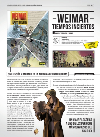 CIVILIZACI%u00d3N Y BARBARIE EN LA ALEMANIA DE ENTREGUERRASDesde la perspectiva actual, la Rep%u00fablica de Weimar parece un remanso de paz entre dos guerras mundiales. Sin embargo, se trata de un per%u00edodo convulso en el que afloraron toda clase de tensiones pol%u00edticas, sociales y culturales de su %u00e9poca, y que termin%u00f3 con la llegada de Adolf Hitler a la jefatura del estado y, por tanto, con la imposici%u00f3n del nazismo en la vida pol%u00edtica alemana. Firmada por un equipo compuesto por los historietistas Martin, Pedragosa y Morata, Weimar. Tiempos inciertos es una novela gr%u00e1fica de m%u00e1s de 200 p%u00e1ginas y de corte hist%u00f3rico que refleja las luces y, sobre todo, las sombras de un momento delicado en que el mundo se precipit%u00f3 casi a ciegas hacia el abismo. Su protagonista es Neumann, un exsoldado alem%u00e1n que despierta con amnesia en la cama de un hospital de campa%u00f1a. La I Guerra Mundial ha terminado hace un a%u00f1o con la rendici%u00f3n de Alemania. Neumann tiene que rehacer una vida de la que desconoce casi todo, salvo algunos destellos confusos y ocasionales que relampaguean a veces en el fondo de memoria. Al salir del hospital, sufre el empuje de dos fuerzas opuestas: la que lo induce a mirar hacia el futuro y construirse una vida nueva, y la que lo impulsa a bucear en el pasado para encontrar respuestas sobre qui%u00e9n es ahora. En esta odisea de autodescubrimiento tropezar%u00e1 con las mentes m%u00e1s preclaras de su %u00e9poca: el arquitecto Walter Gropius (fundador de la escuela Bahuaus), el fil%u00f3sofo Martin Heidegger, el f%u00edsico Albert Einstein, el compositor Arnold Sch%u00f6nberg, el dramaturgo Bertold Brecht y, por encima de todos, el escritor Thomas Mann, autor de Los Buddenbrook, La muerte en Venecia y, sobre todo, La monta%u00f1a m%u00e1gica, novela que este a%u00f1o cumple un siglo desde su primera publicaci%u00f3n, que le vali%u00f3 a Mann el Nobel de Literatura y con la que Neumann tiene una conexi%u00f3n muy especial. Como broche de oro, incluye un dosier de casi 30 p%u00e1ginas con explicaciones extensas y rigurosas sobre las figuras culturales que aparecen en el c%u00f3mic.MARTIN / PEDRAGOSA / MORATAWEIMARTIEMPOS INCIERTOSHIST%u00d3RICOVolumen %u00fanicoCarton%u00e9. 19 x 26,5 cm. 232 p%u00e1gs. Color %u2022 PVP: 29,50 %u20acISBN ED. CASTELLANO: 978-84-679-7290-0ISBN ED. CATAL%u00c0: 978-84-679-7291-7PREVIEW EN LAS P%u00c1GINAS SIGUIENTESUN VIAJE FILOS%u00d3FICOA UNO DE LOS PERIODOSM%u00c1S CONVULSOS DELSIGLO XXTAMB%u00c9 ENCATAL%u00c0!NOVEDADES ENERO 2025 %u2022 PRODUCCI%u00d3N PROPIA P%u00c1G. 17 //